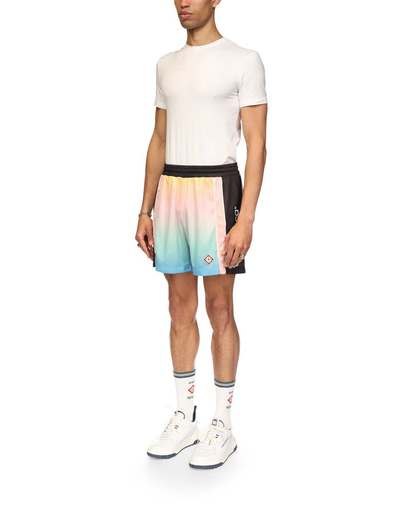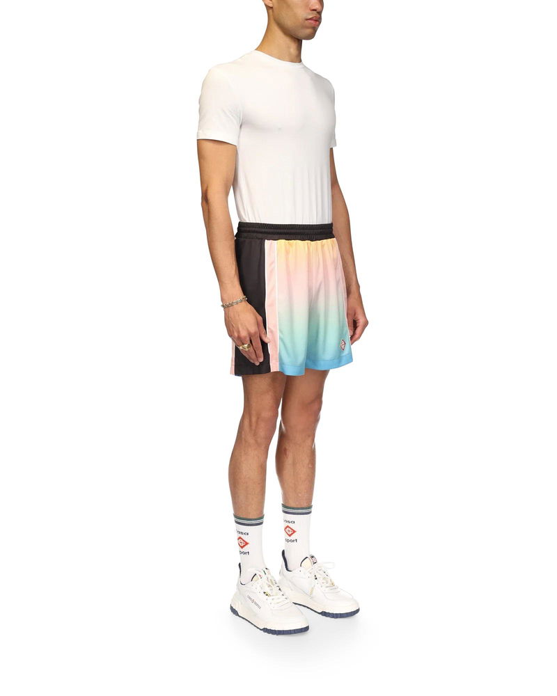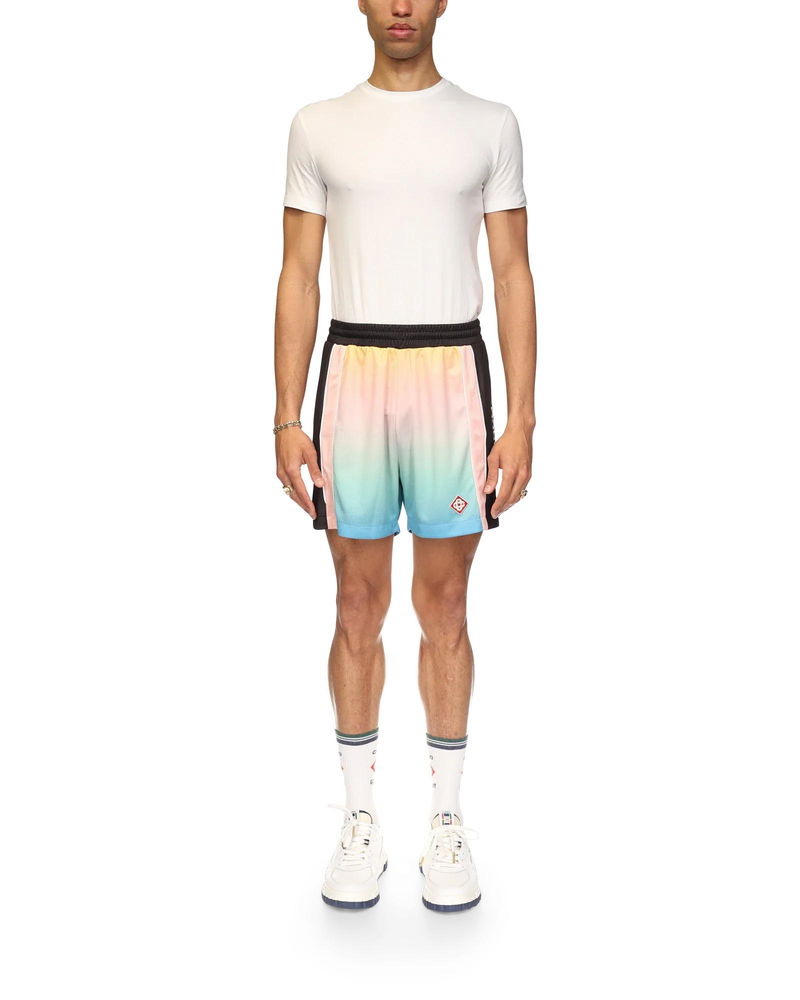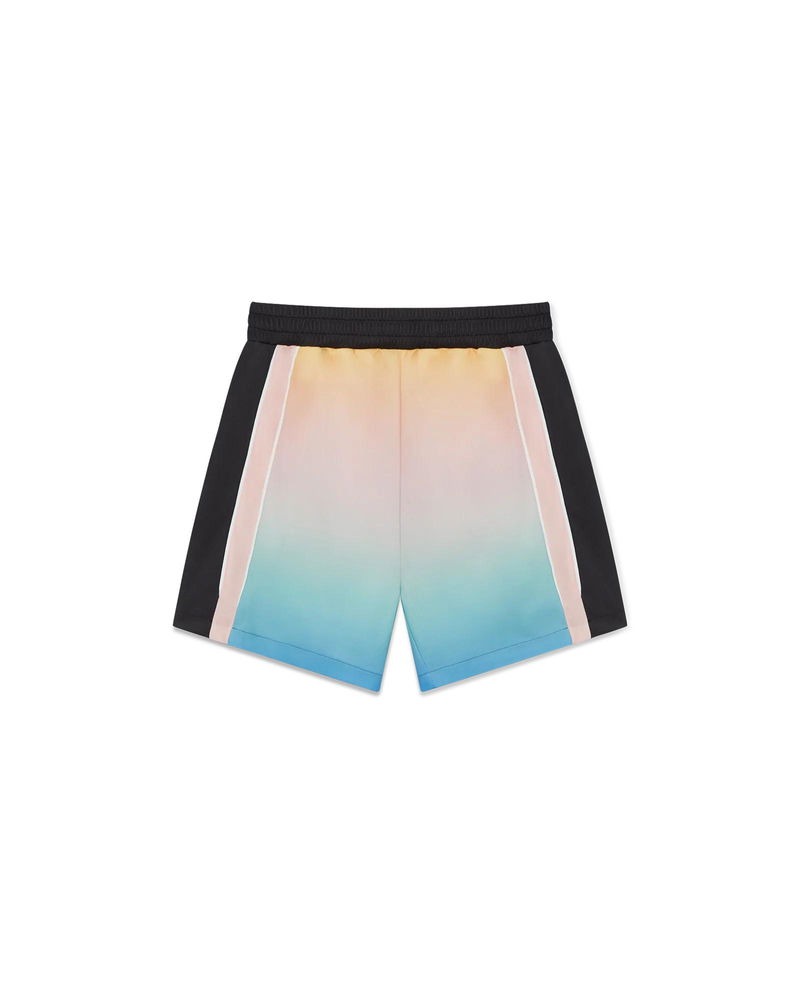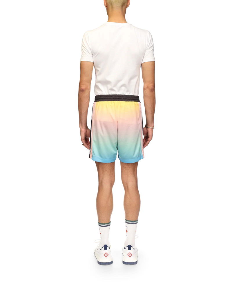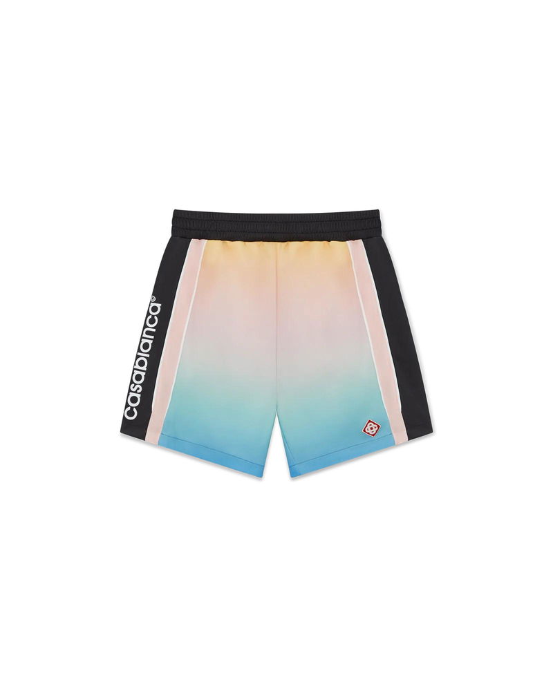 The pastel gradient football shorts are a sportswear design featuring a gradient series of pastel colours emphasising ethereal themes core to our brand. Crafted from birdseye mesh incorporating with the house's signature diamond logo patch and Casablanca logo stripe detail down the side. Completed with an elasticated waistband with drawstring fastening and in-seam side pockets. Printed birdseye mesh fabric Main: 100% polyester Applique: 95% rayon 5% polyester Pastel gradient multicolour Specialised dry clean only Made in Portugal Fits true to size, take your regular size The model is 187cm/6'1 and is wearing a size M Pastel Gradient Football Shorts, Size Small by Casablanca Paris