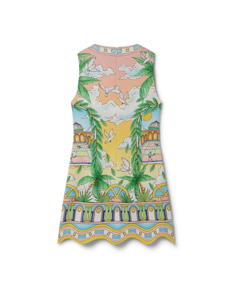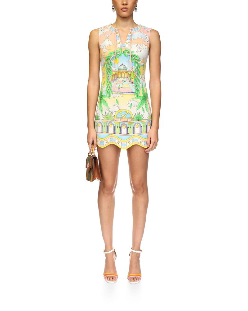The Paysage Ideal cocktail dress is a sleeveless mini dress with an A-line silhouette featuring seasonal artwork with a traditional layout that focuses on the arch, symmetry and Casablanca's ideal universe with a light and idealistic colour palette, emphasising ethereal themes core to our brand. Completed with a back zip closure, v-shaped neck and hemline detail inspired by the Memphis wave - one of our brand's foundational design elements.