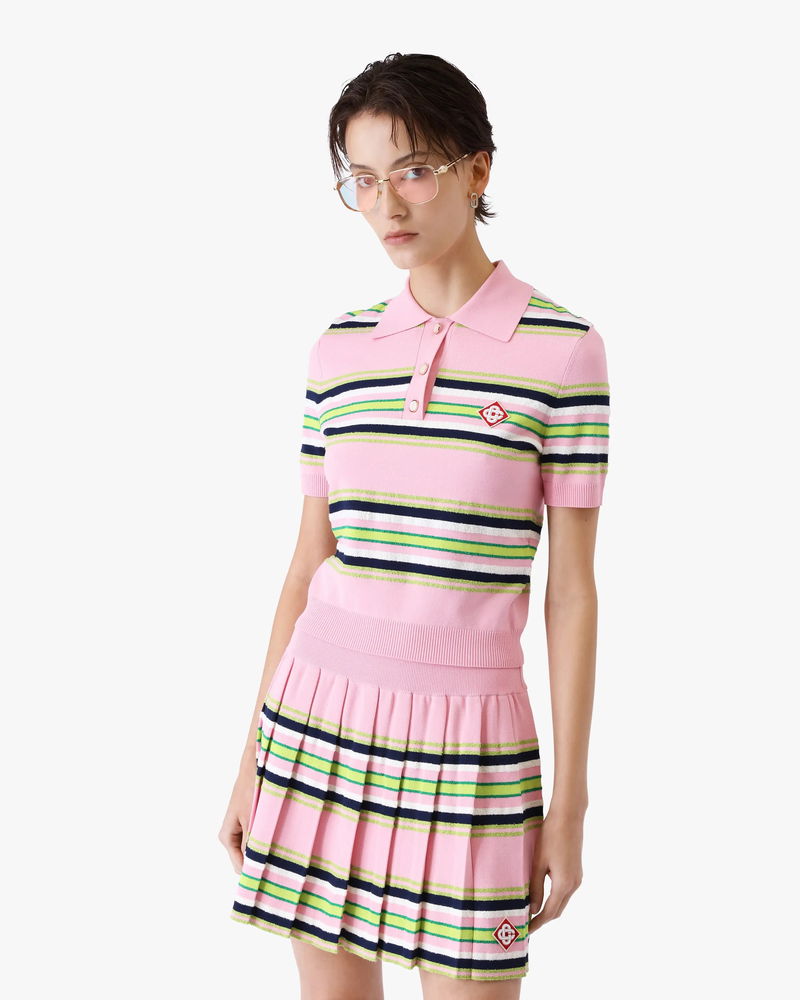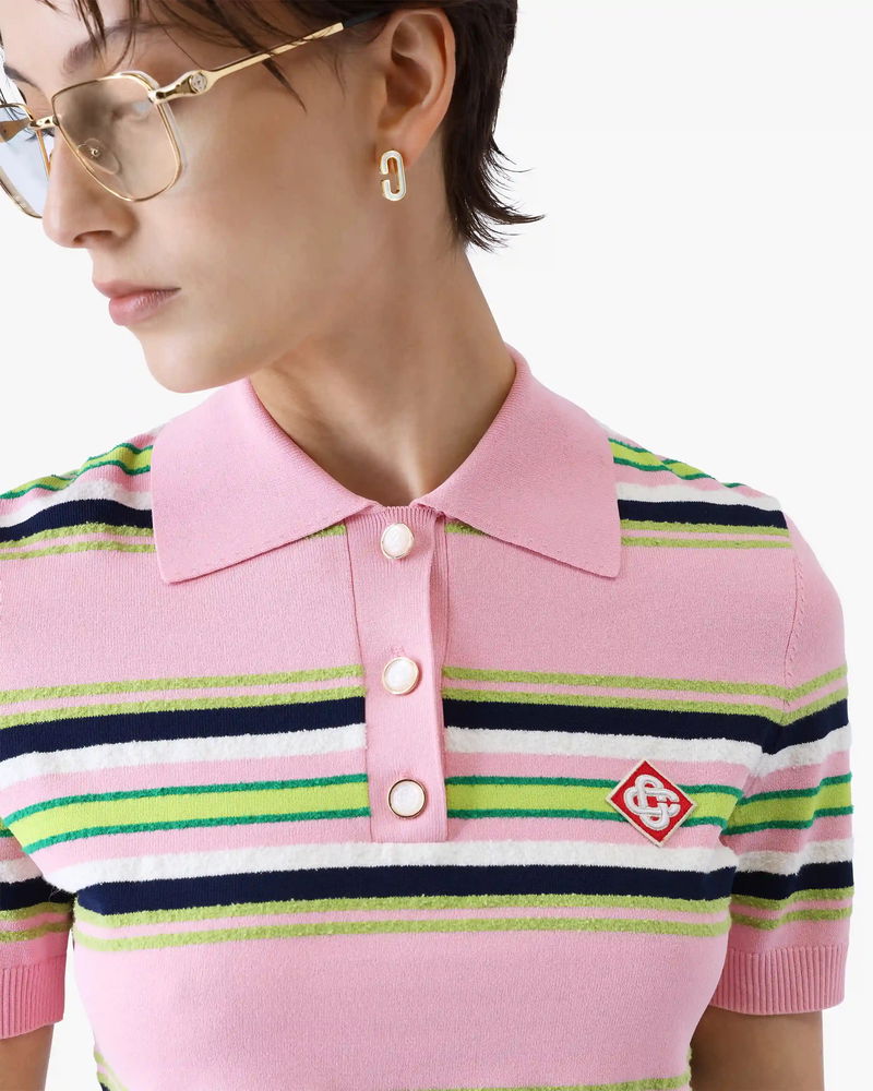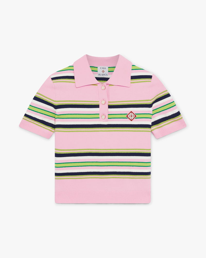 The pink and green striped fitted polo shirt is a refined knitted design, featuring the house's signature diamond logo. Completed with button closure, signature gold rim pearl buttons, rib cuffs, hem, collar and placket, and a slim silhouette.