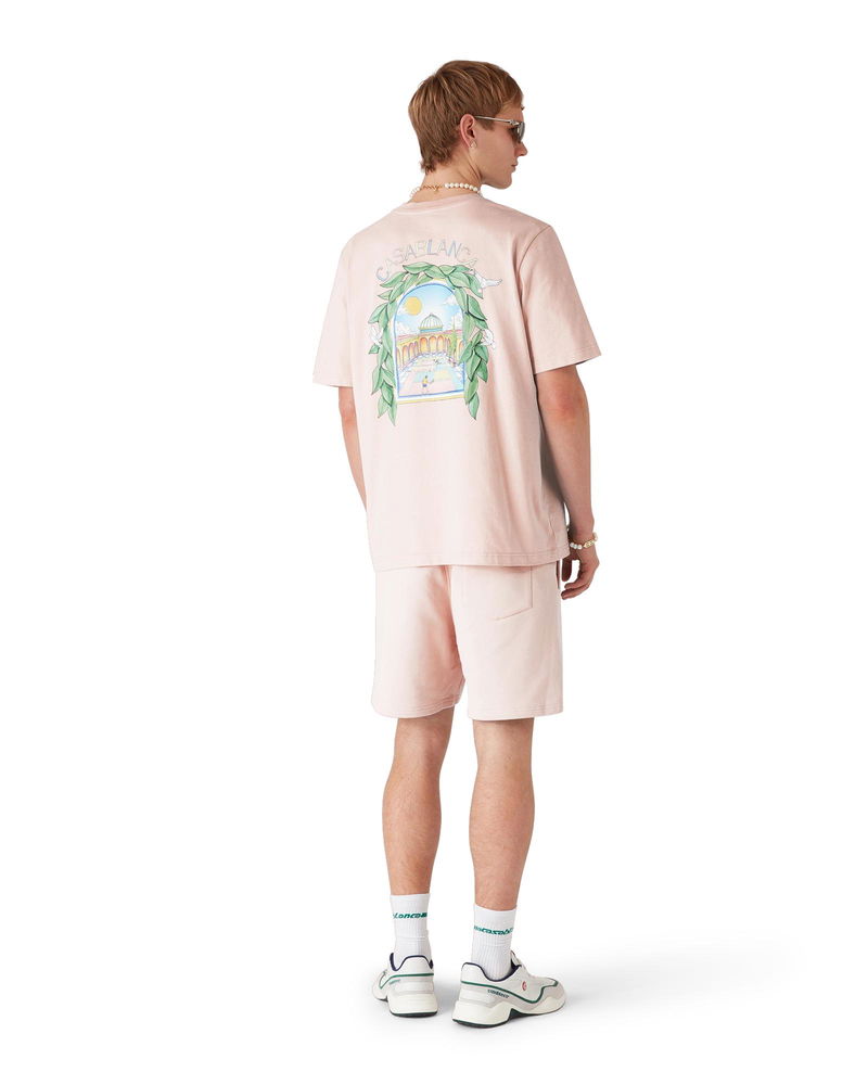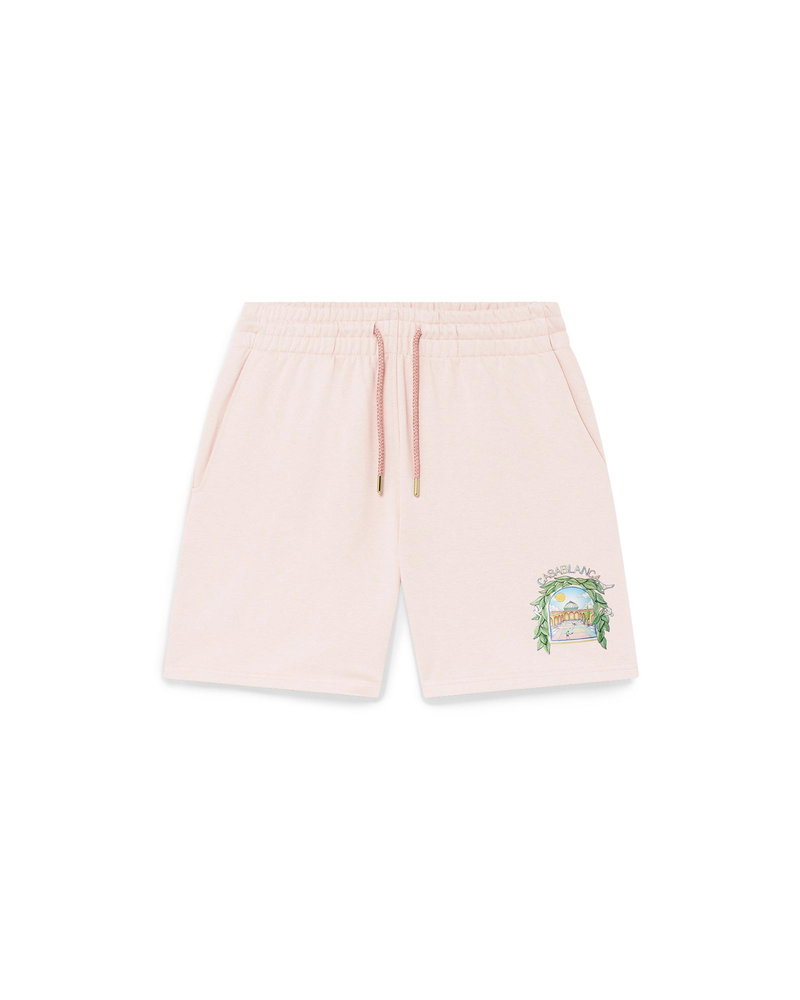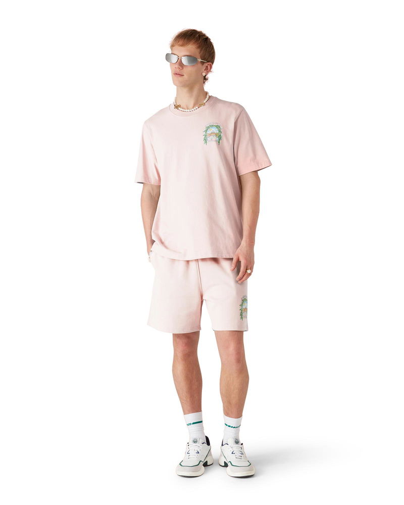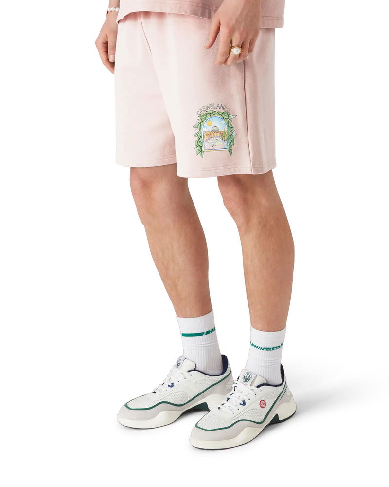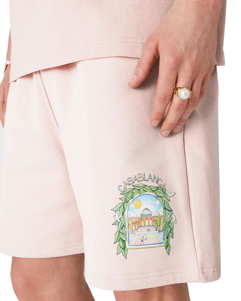 The Casa L'Arche sweatshorts are a refined printed design featuring the house's seasonal artwork with design elements of the arch, nature, architecture, and tennis. Completed with and elasticised waistband, gold-tipped drawstring fastening, side pockets, and a back patch pocket. Cotton loopback jersey fabric 100% organic cotton Colour: pink Delicate machine wash Made in Portugal Relaxed fit The model is 187cm/6'2 and is wearing a size M Exclusive to casablancaparis. com and our Paris Flagship store Pink L'Arche Sweatshorts, Size XS by Casablanca Paris