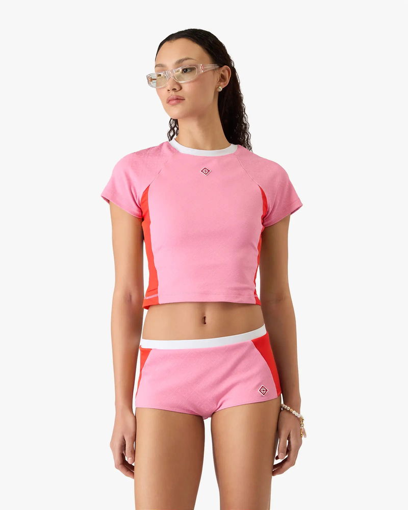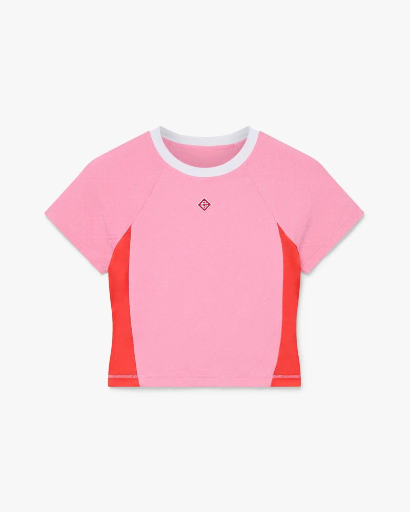 The pink monogram short-sleeve rash top is a refined design featuring the house's signature monogram pattern in a vibrant pink, red and white colourway. Completed with a classic crew neckline and sleeves for elevated poolside coverage. Designed to be worn with the coordinating pink monogram bikini shorts.