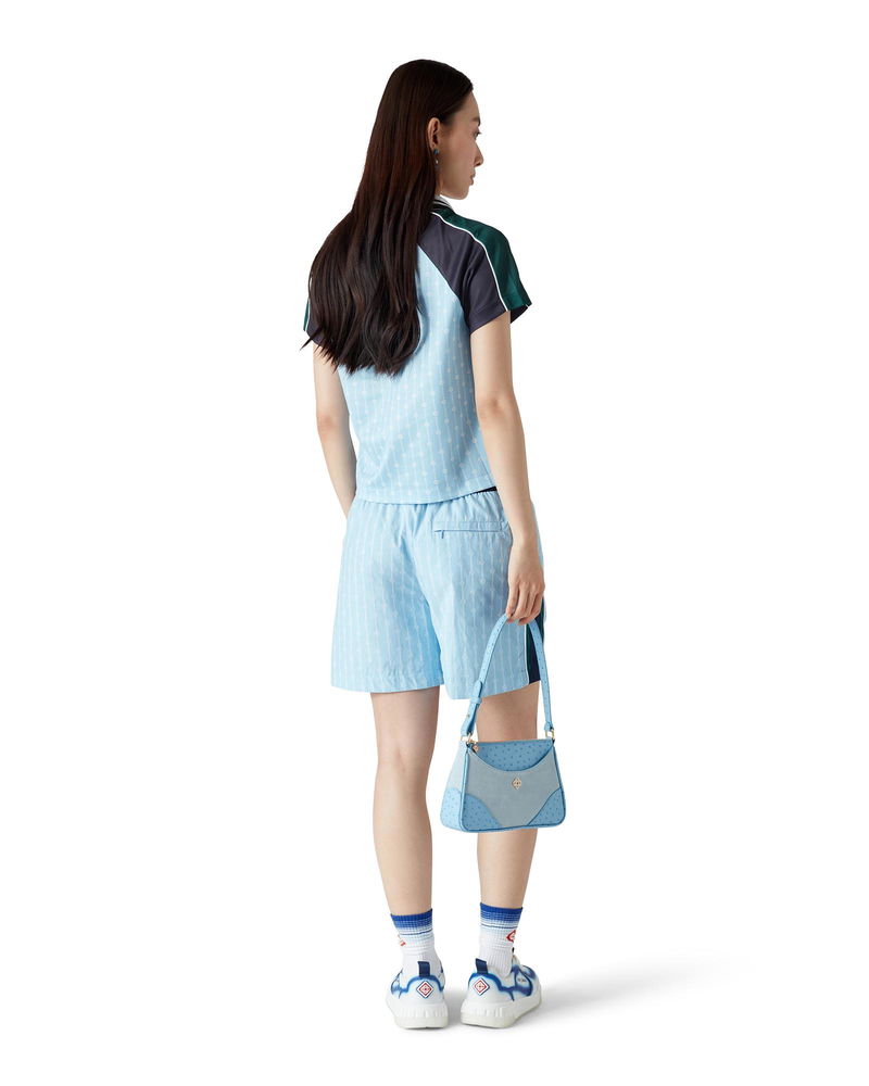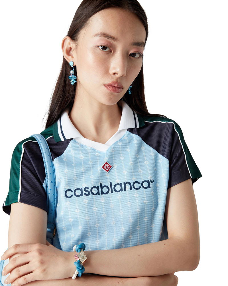 The Pinstripe Laurel football shirt is a short-sleeve sportswear design crafted from a birdseye mesh fabric featuring the house's signature interlocking CC logo. Completed with black and green panels on the shoulders and sleeves, a signature diamond logo, the Casablanca logo, white piping, a rib v-neck and collar with black, white and green striped edge detail.