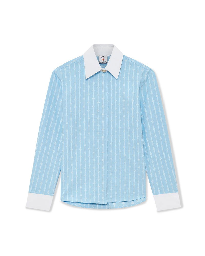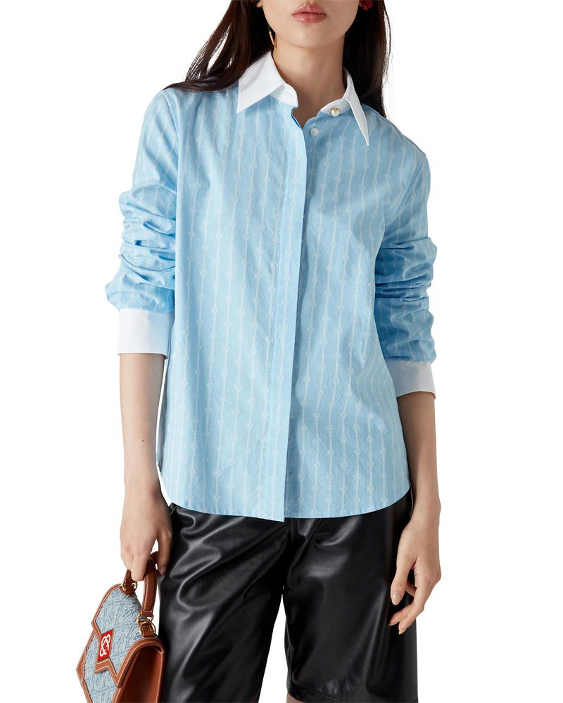 The Laurel pinstripe long-sleeve shirt is a tailored design crafted from cotton jacquard fabric. Completed with a contrast white cuffs and a point collar, hidden button closure with interlocking CC logo corozo buttons, and a curved hem.