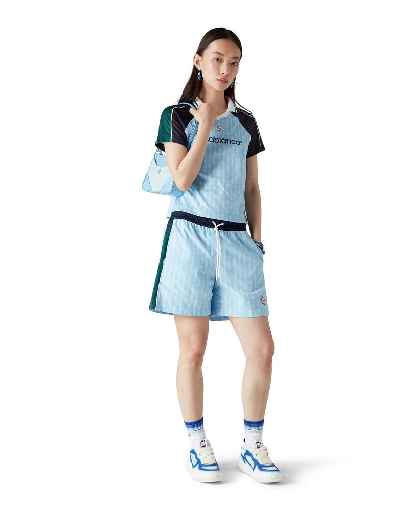 The pinstripe track shorts are a sportswear design crafted from cotton fabric featuring the house's interlocking CC logo. Completed with a signature diamond logo, an elasticated waistband, gold-tipped drawstring fastening, in-seam side pockets with zip closure, stripe detail down the sides, and a welt back pocket with zip closure.
