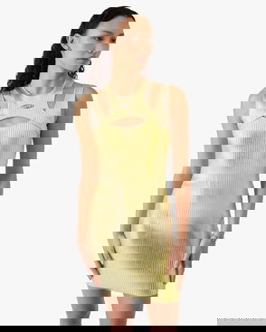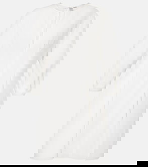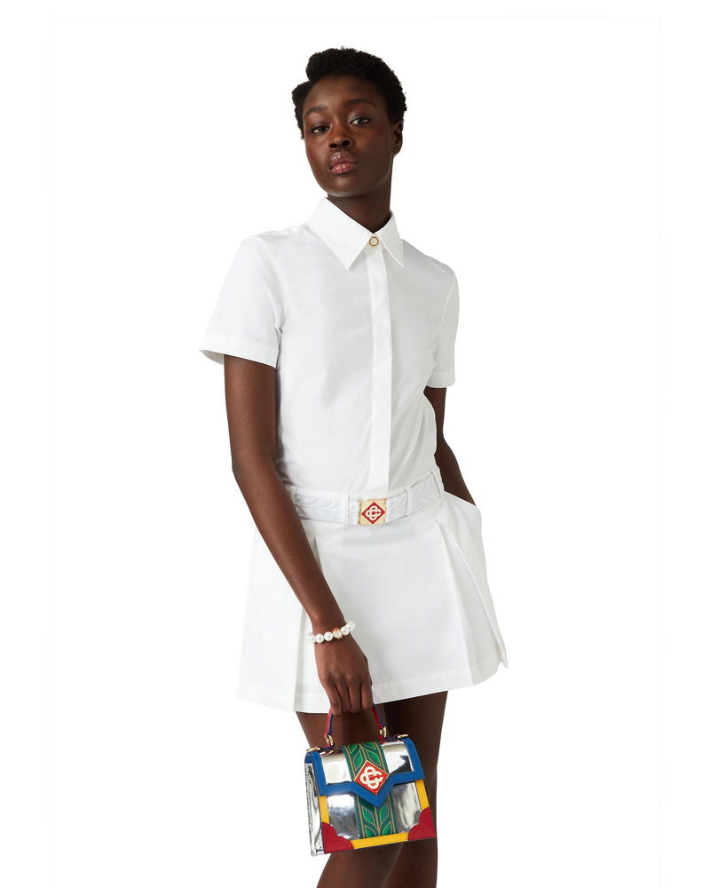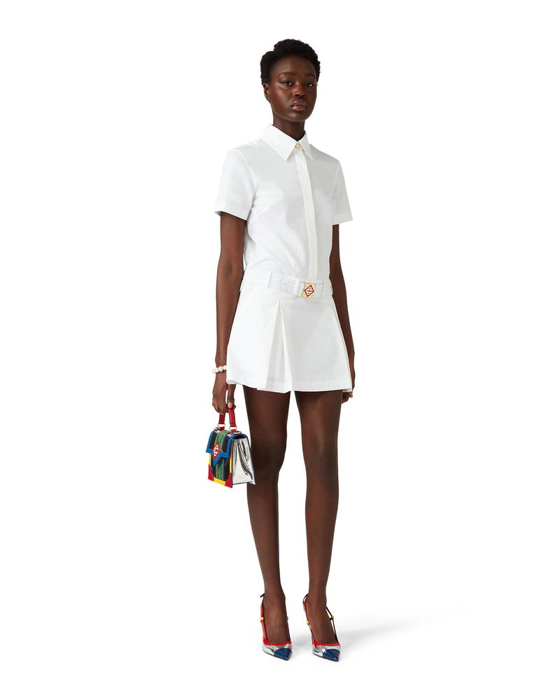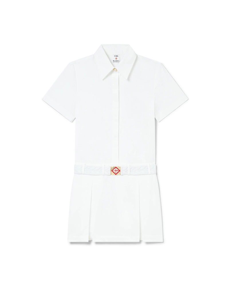 The pleated tennis mini dress is a short-sleeve mini style with an A-line silhouette crafted from cotton twill fabric. Completed with front button closure, an open collar, a breast pocket, a waistband, and an inverted pleated skirt panel. Cotton twill fabric