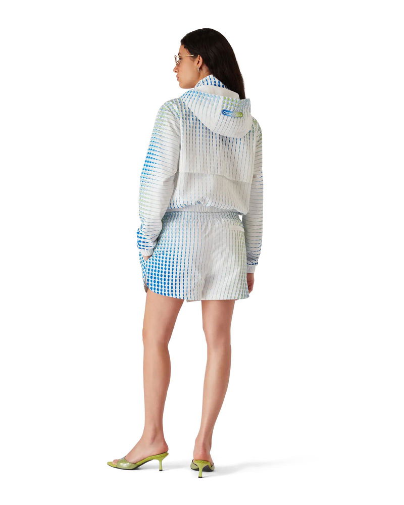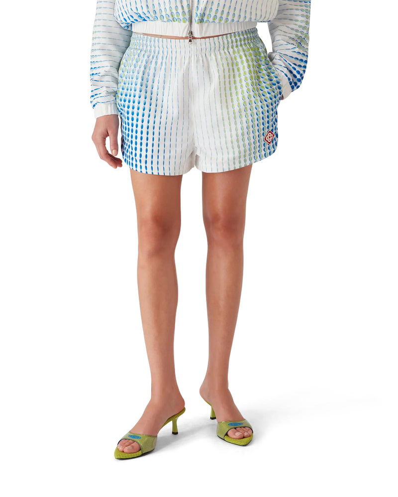 The printed poly taffeta shorts are a classic design featuring the house's signature diamond logo patch and unique artwork created in collaboration with Martin Naumann, known for his work with gradients and texture effects. Completed with an elasticised waistband, drawstring fastening, a lining, side pockets, and curved hem detail.