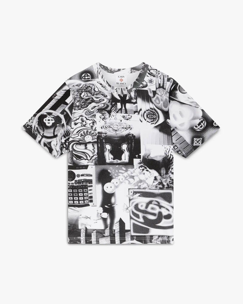 The Rave Collage short-sleeve mesh t-shirt is a refined design, featuring seasonal artwork that interprets a messy collection of rave flyers and iconography transposed into a grainy texture. Completed with a classic crew neckline. Printed mesh fabric 93% polyester 7% elastane Rave Collage print Delicate machine wash Made in Portugal The model is 185cm / 6'1 and is wearing size M Relaxed fit Rave Collage Short Sleeve Mesh T-Shirt, Size XS by Casablanca Paris