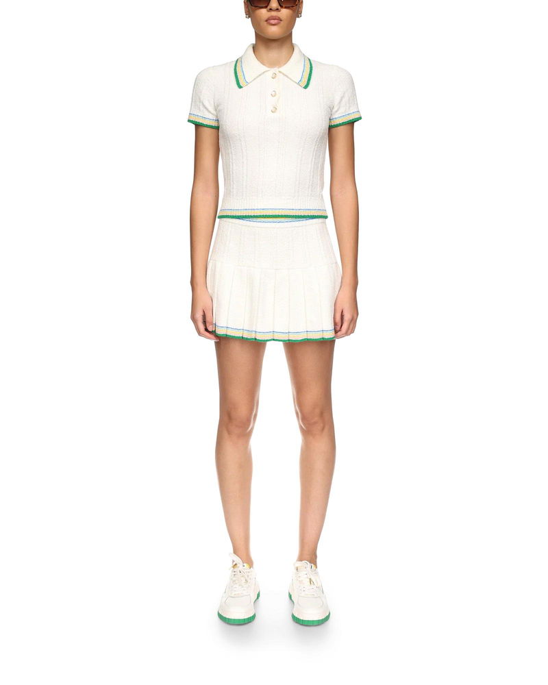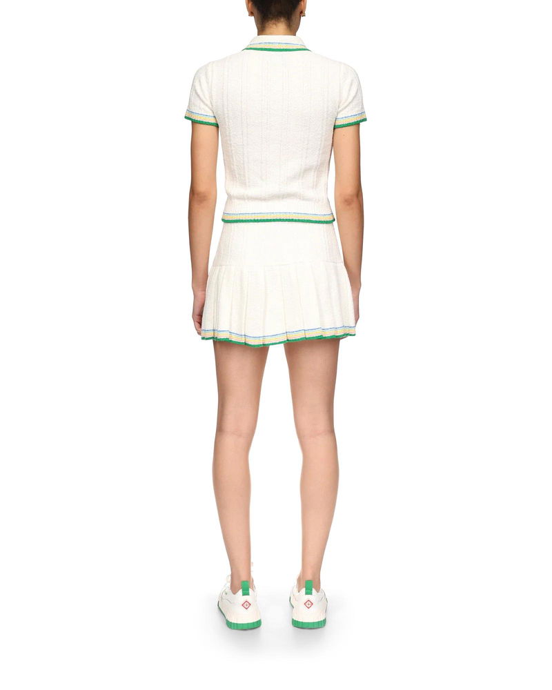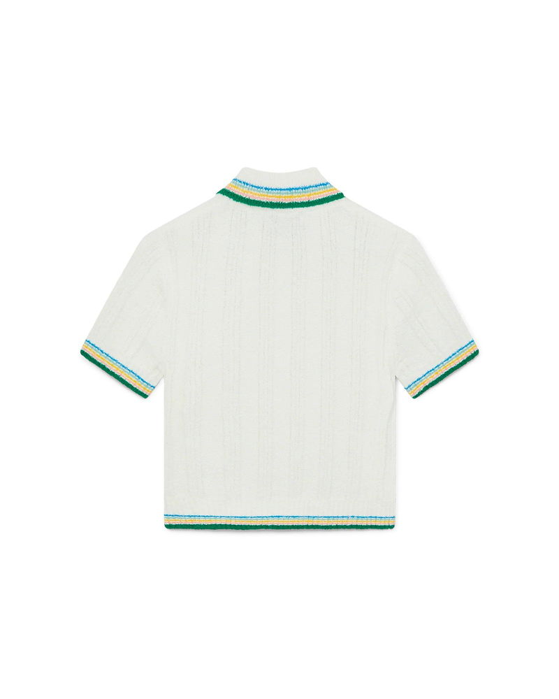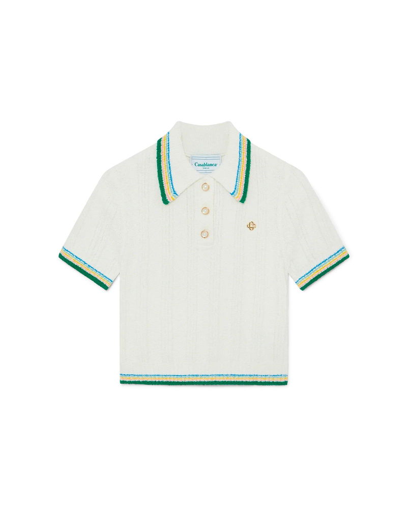 The rib boucle polo shirt has a soft ribbed texture and features the house's gold-plated interlocking CC logo rivet on the chest. Crafted from a cotton-blend rib knit fabric and finished with signature gold rim pearl buttons, and stripe detailing on the collar, cuffs and hem. The colour palette for this collection is light and idealistic, emphasising ethereal themes core to our brand.