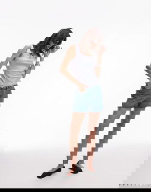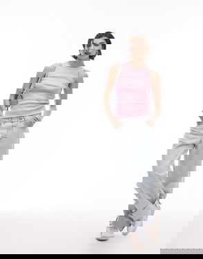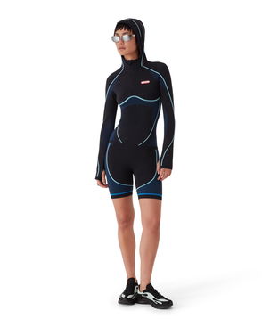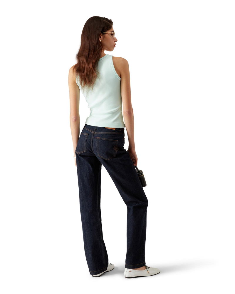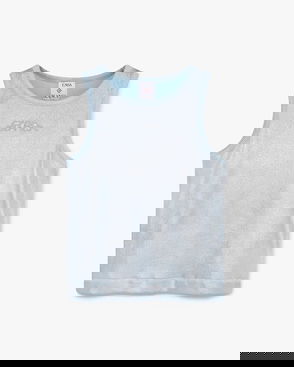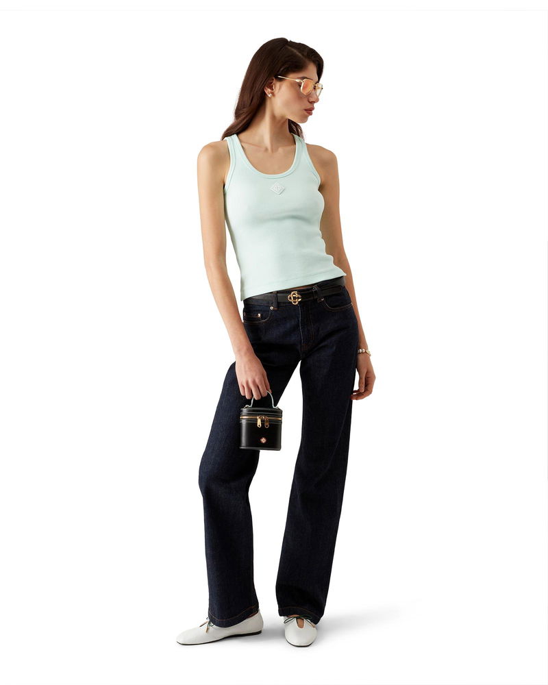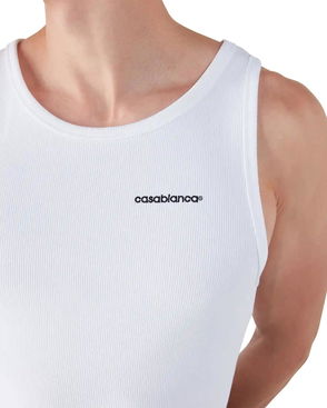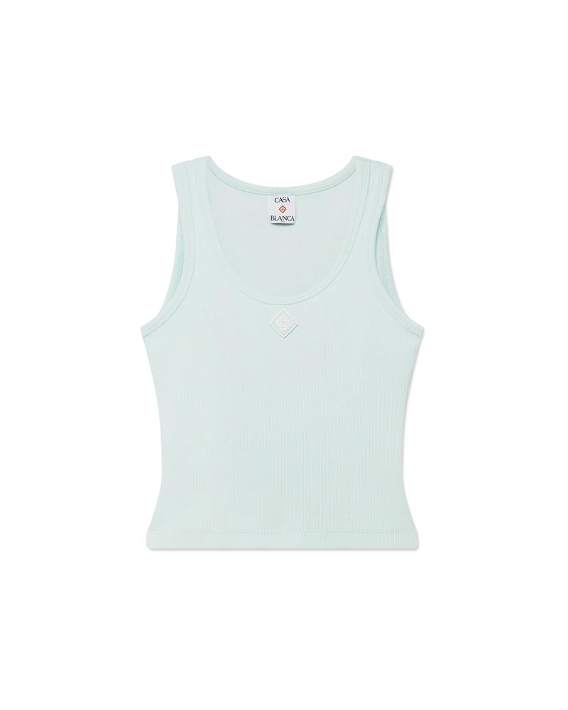 The ribbed jersey tank top is a sleeveless fitted short-style, crafted from ribbed jersey fabric. Completed with a silicon interlocking CC logo patch, a scoop neck, and white contrast wave pattern detail edges around the neck and armholes.