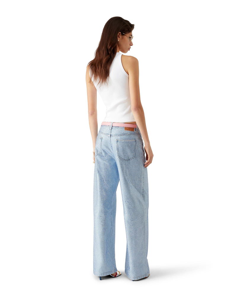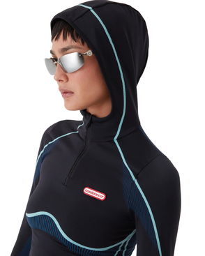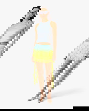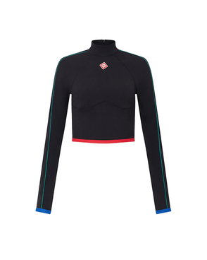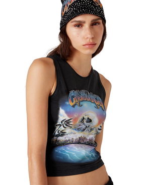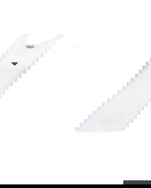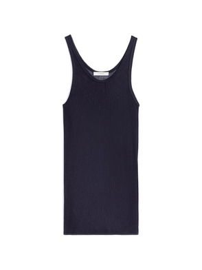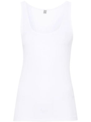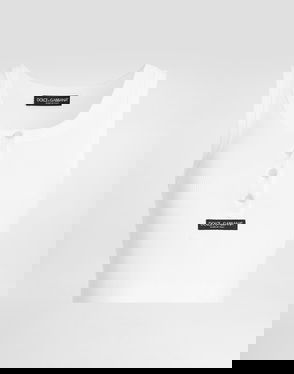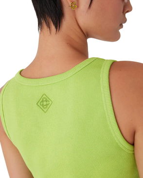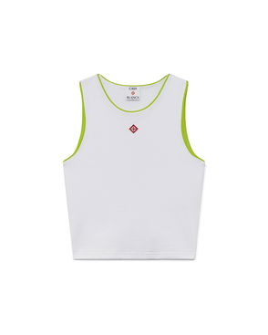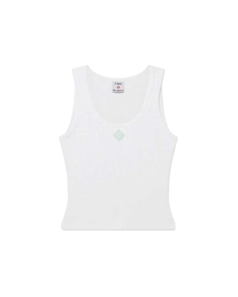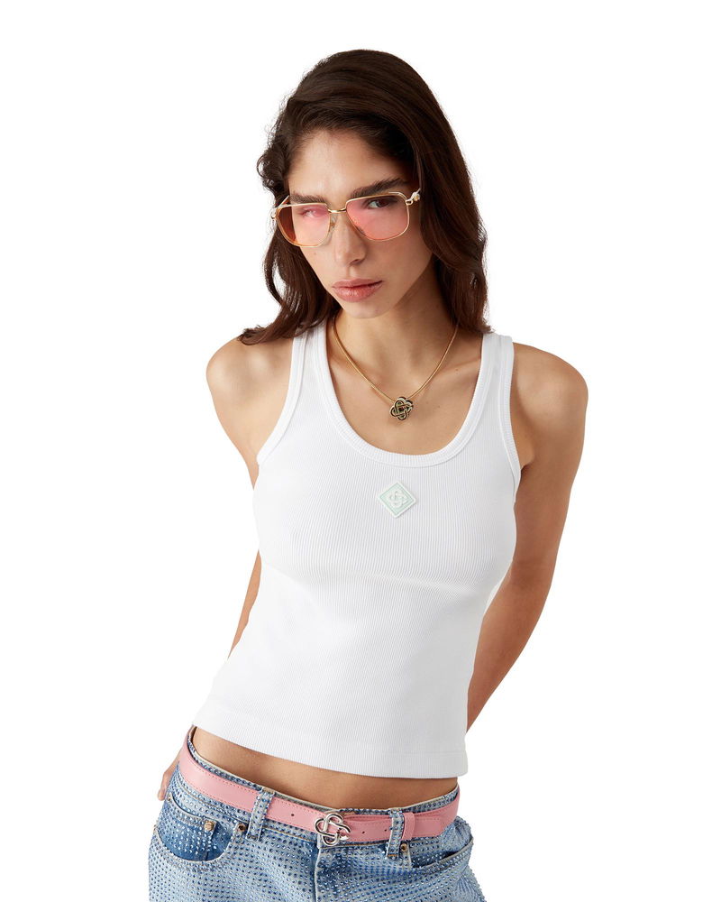The ribbed jersey tank top is a sleeveless fitted short-style, crafted from ribbed jersey fabric. Completed with a silicon interlocking CC logo patch, a scoop neck, and white wave pattern detail edges around the neck and armholes.