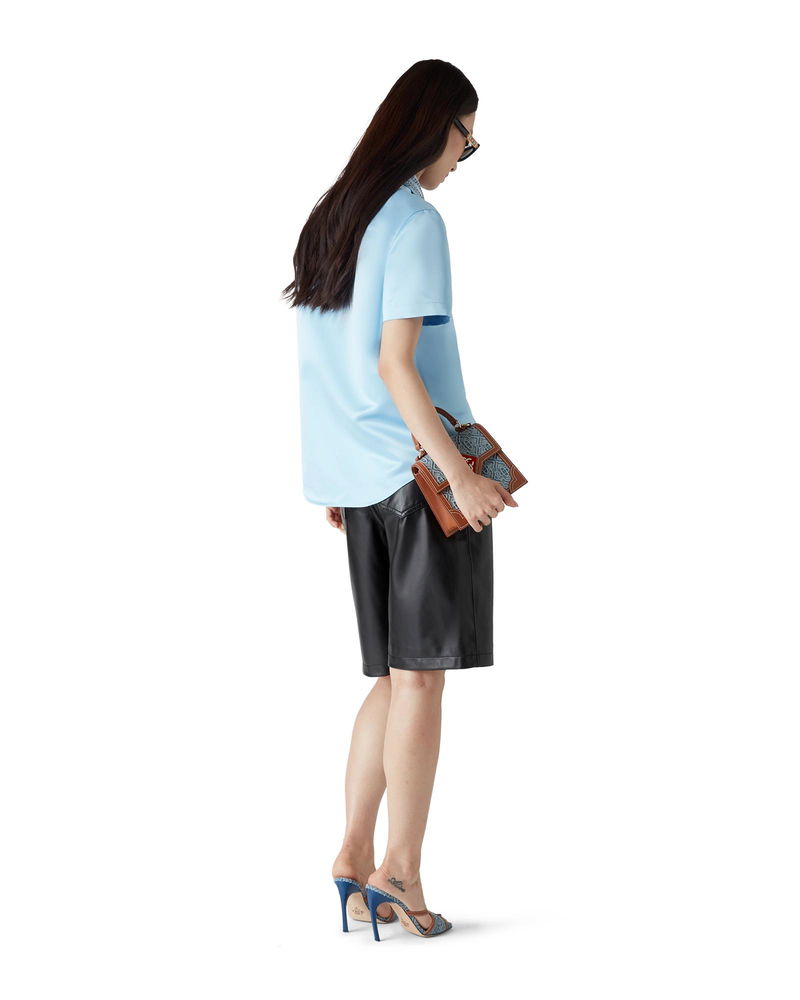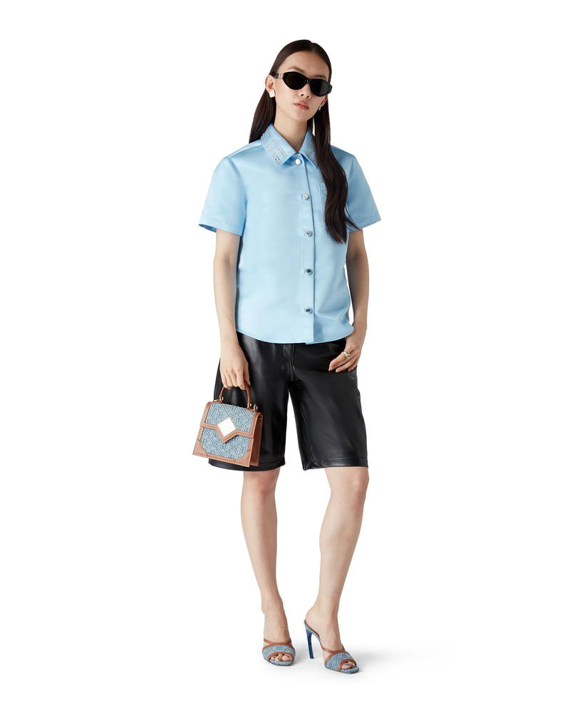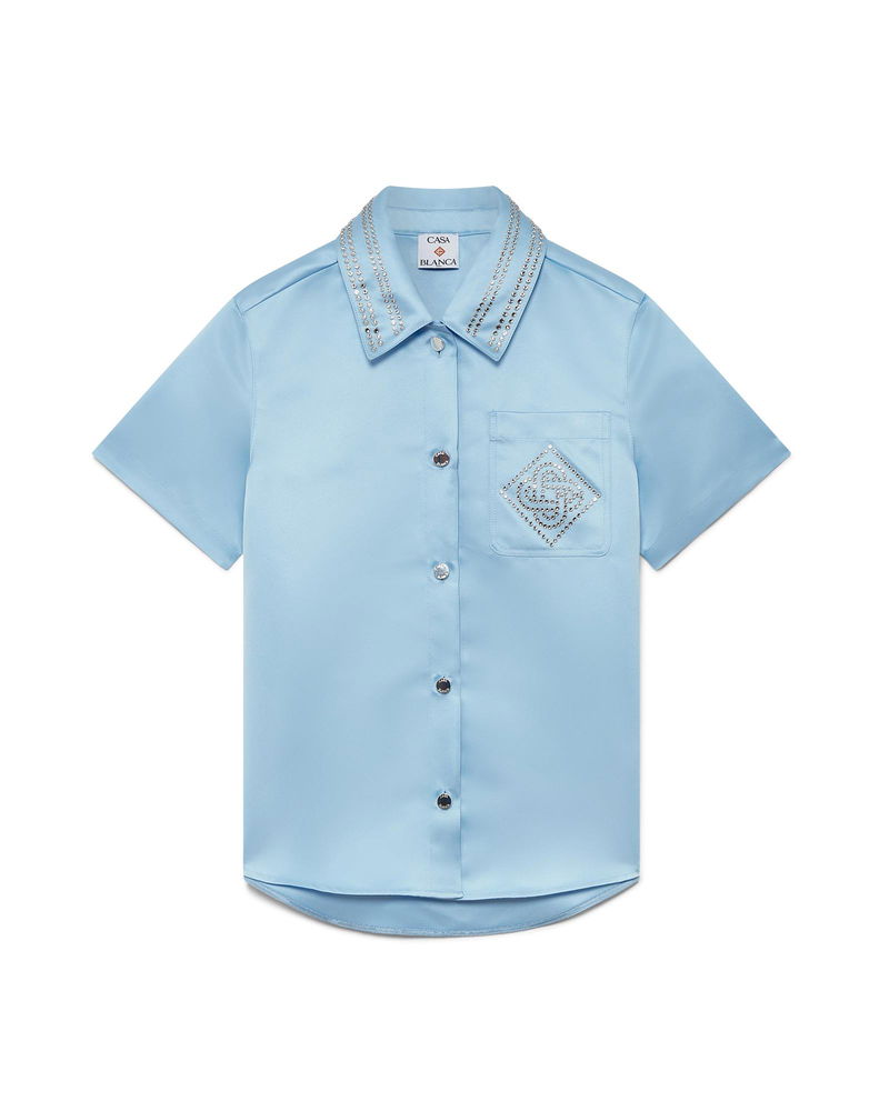 The satin short-sleeve shirt is a classic design crafted from satin fabric. Completed with button closure, branded gold-plated buttons, a point collar, a curved hem, a breast pocket, and beading detail on the collar and breast pocket.