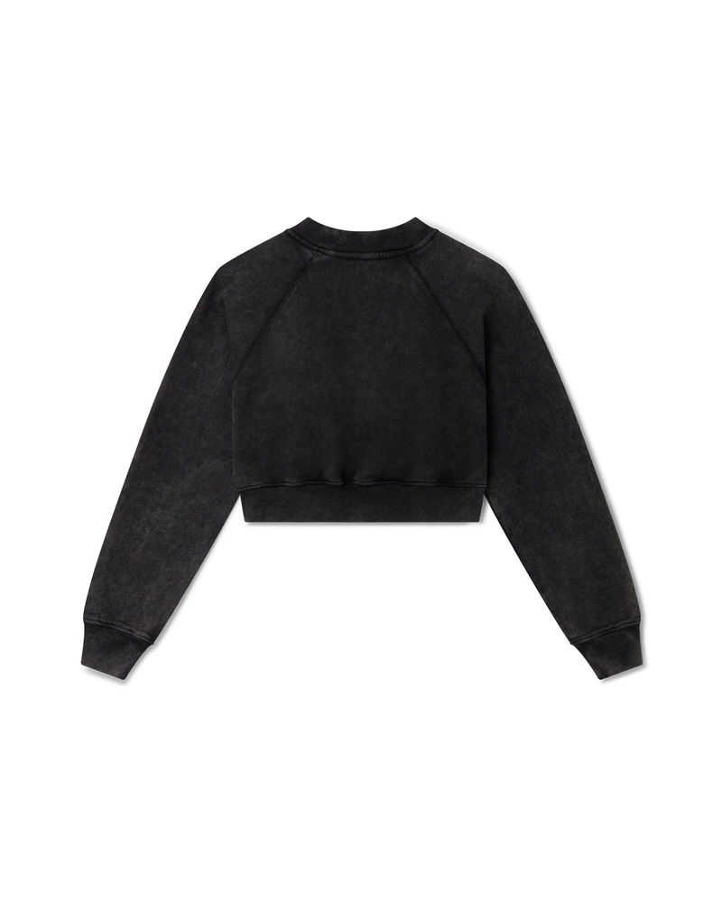The School of Beautiful Cropped Sweatshirt is a faded black jersey sweater with embroidered artwork across its chest. Made from 100% organic black cotton, the sweater is a classic crew neck style with long sleeves and a cropped body intended to finish above the navel.