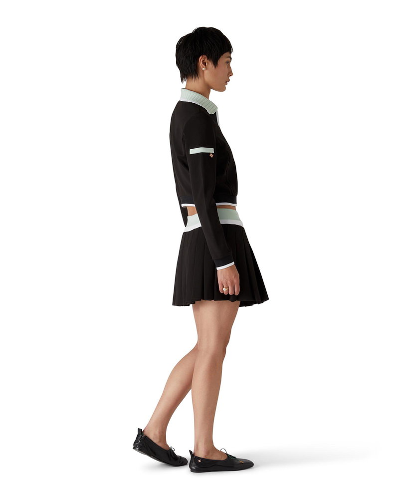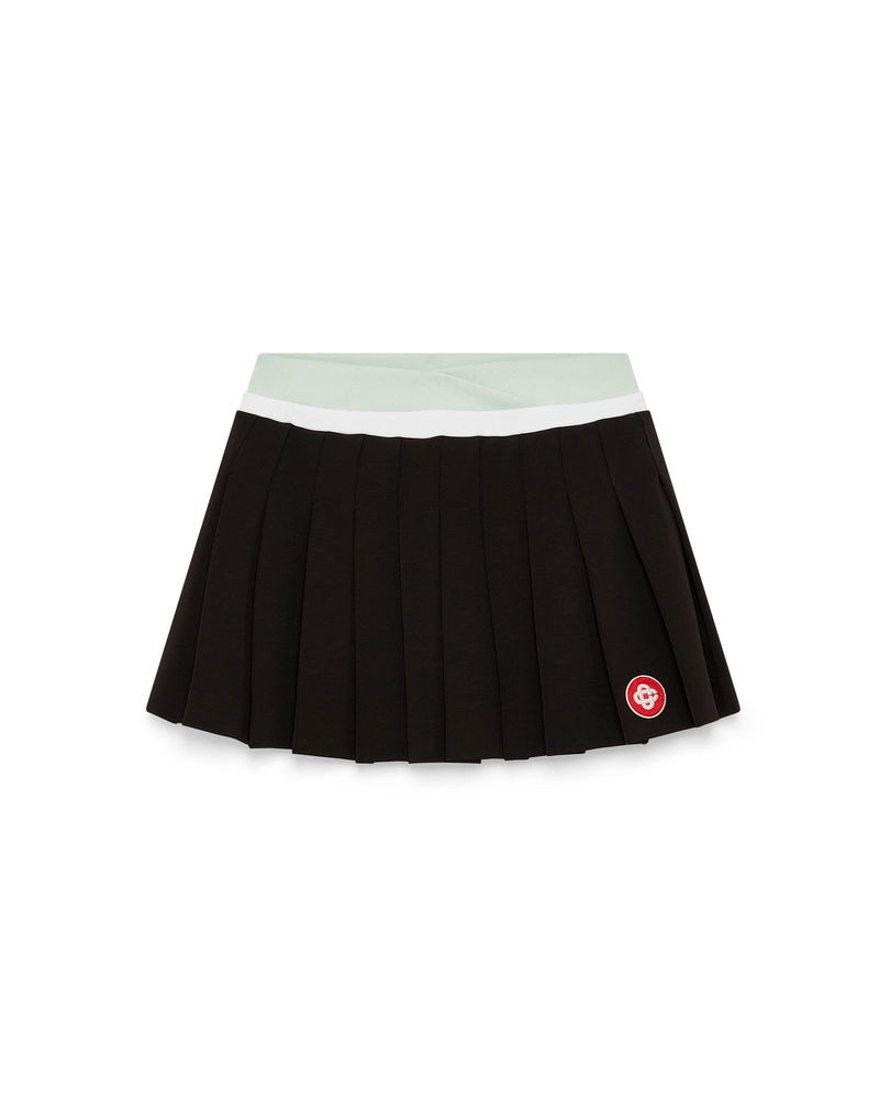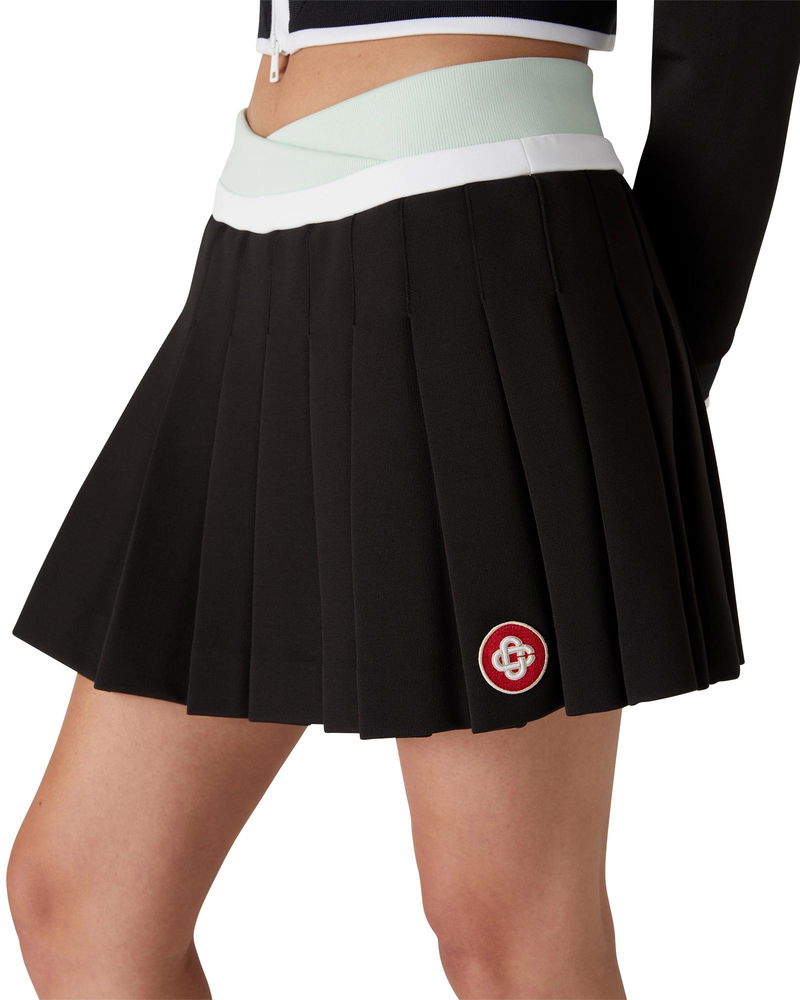 The scuba pleated mini skirt is a short style with an A-line silhouette featuring the house's signature diamond logo, crafted from a viscose fabric. Completed with an overlapped, green and white knitted waistband, and a pleated panel.