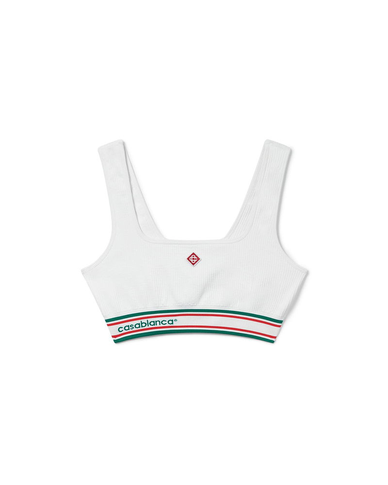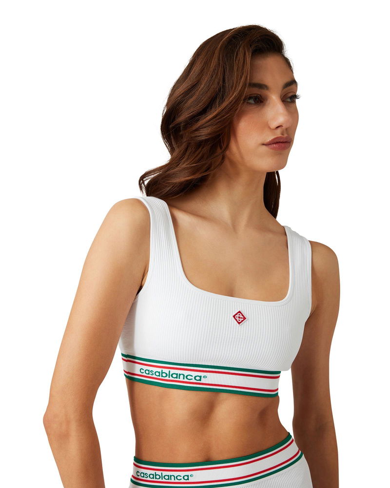 The seamless bralette is a streamlined sportswear-inspired design featuring signature tennis stripe design with Casablanca branding and diamond logo patch. Crafted from a seamless stretch fabric, offering a refined silhouette with minimal construction for a sleek silhouette. Completed with an elasticised underband, straps, and a scoop neck.