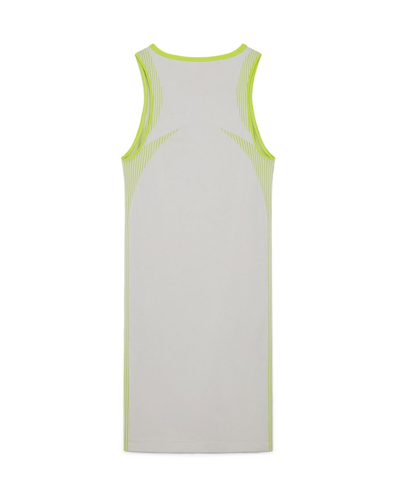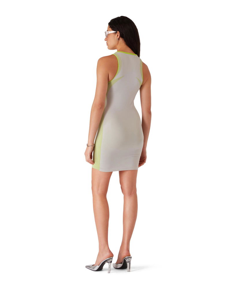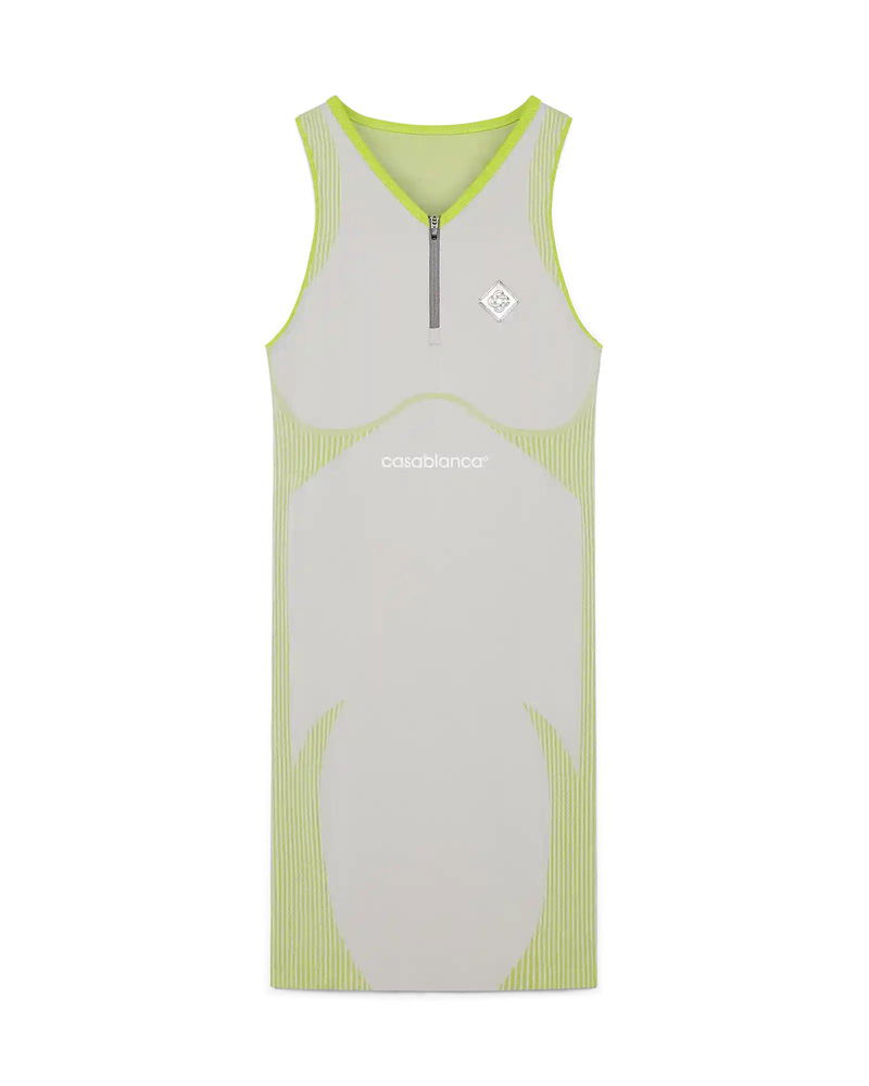 The seamless dress is a sleeveless fitted design featuring the house's silver diamond logo, and the Casablanca logo at its centre. Completed with a shallow V-neckline, a zip closure featuring the house's signature diamond zipper tab, and panel detailing for added support.