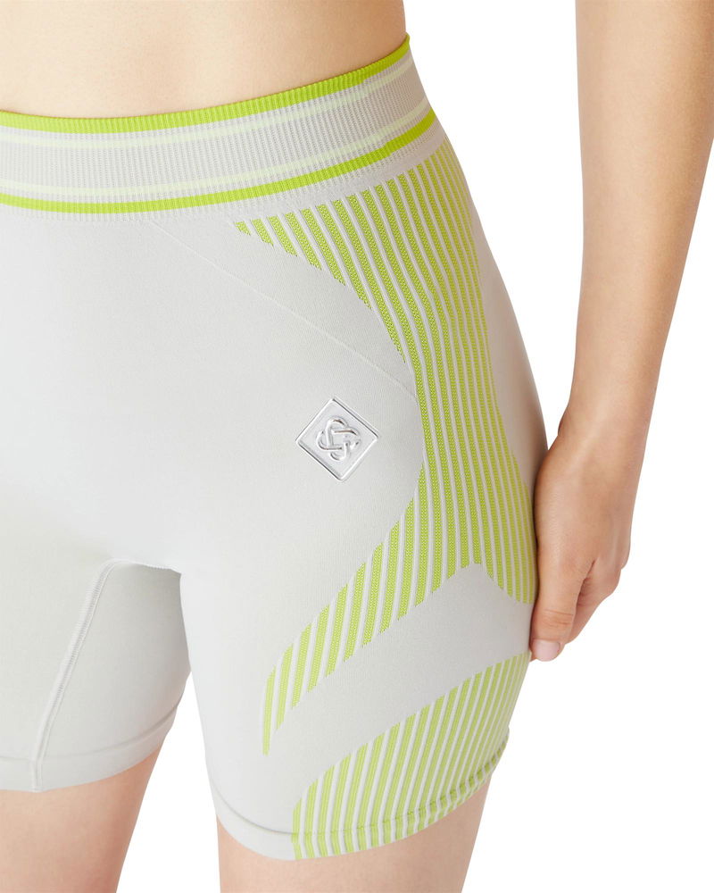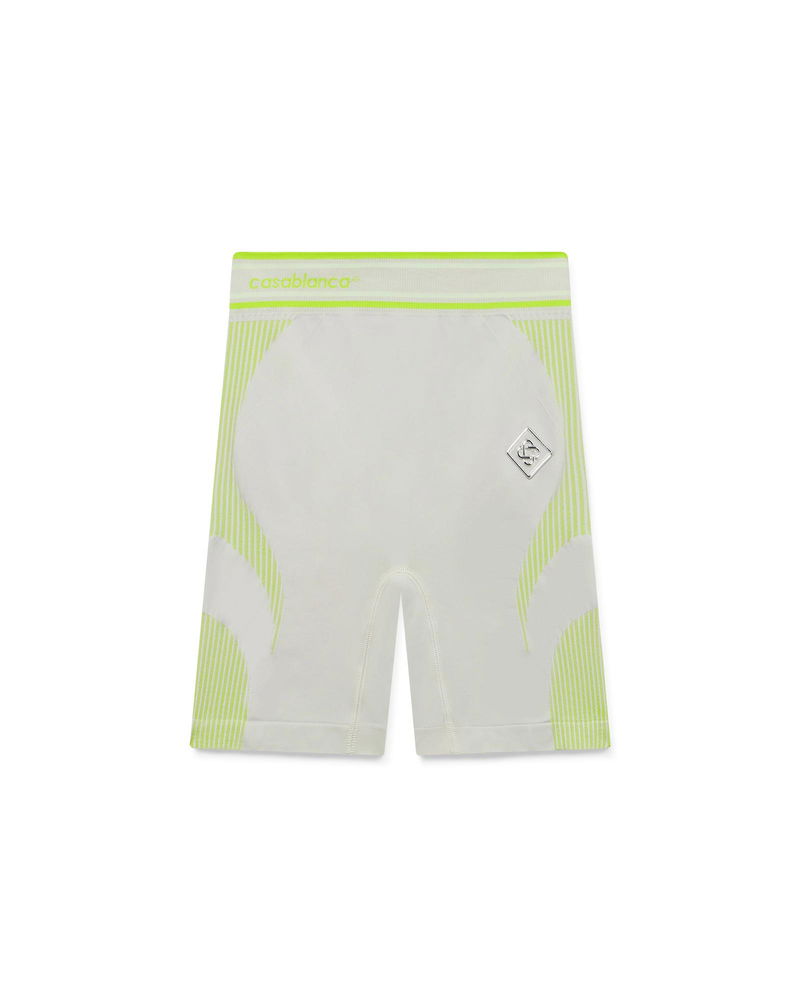 The seamless design is crafted from technical fabric featuring the silver Casablanca diamond logo with elasticated waist. Completed with refined athletic construction. The seamless shorts are a streamlined sportswear-inspired design featuring signature diamond logo patch. Crafted from a seamless stretch fabric, offering a refined silhouette with minimal construction. Completed with a flattering cut, an elasticised waistband featuring the house's Casablanca logo and stripe detail.