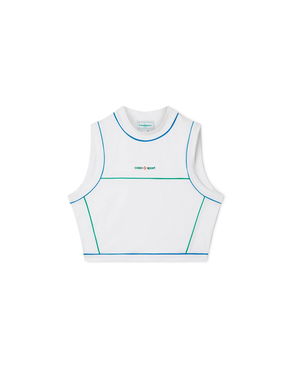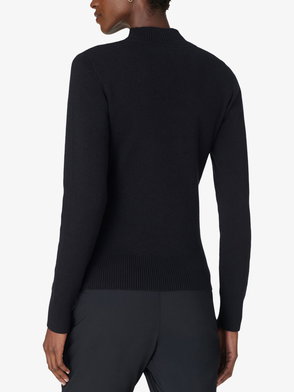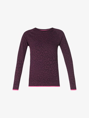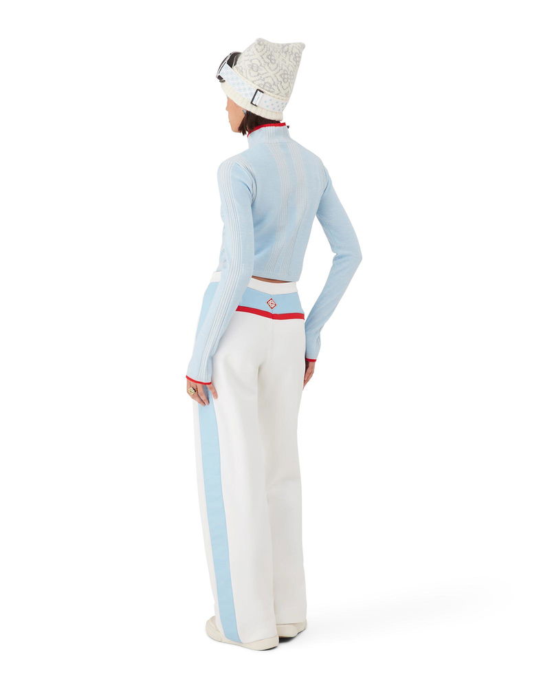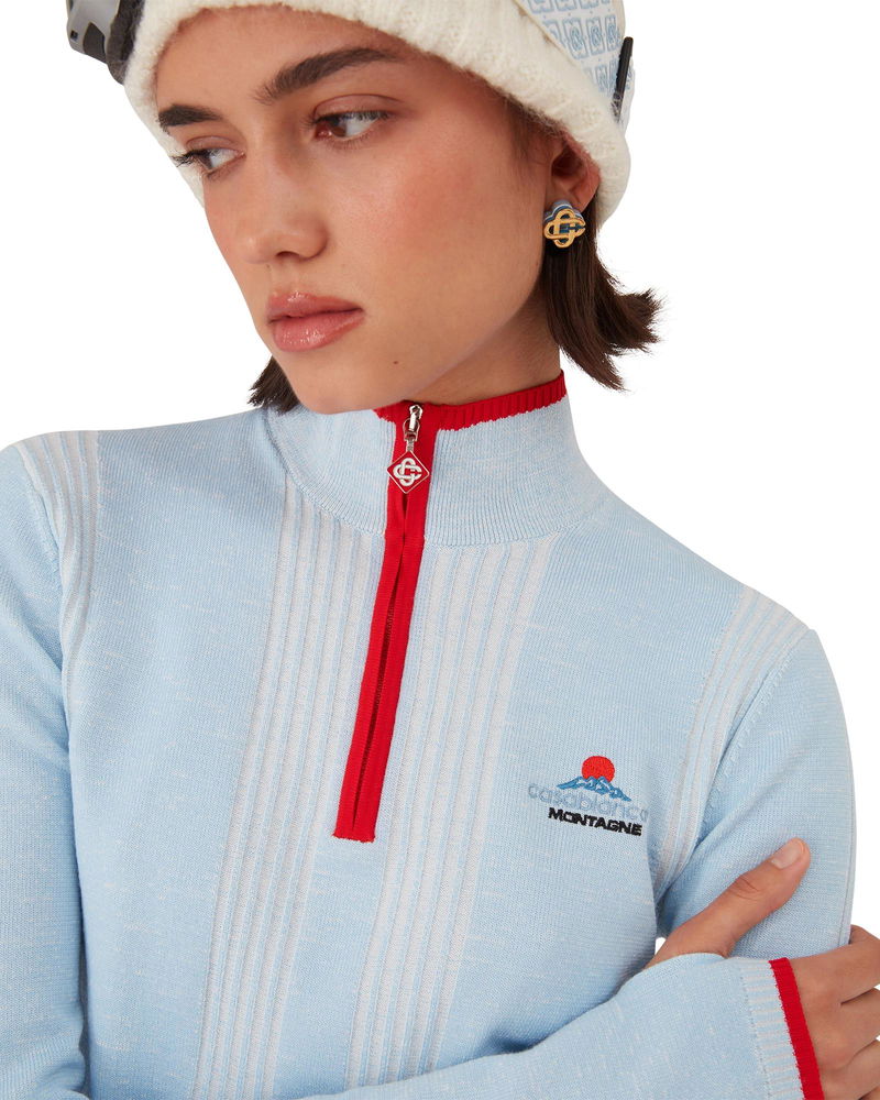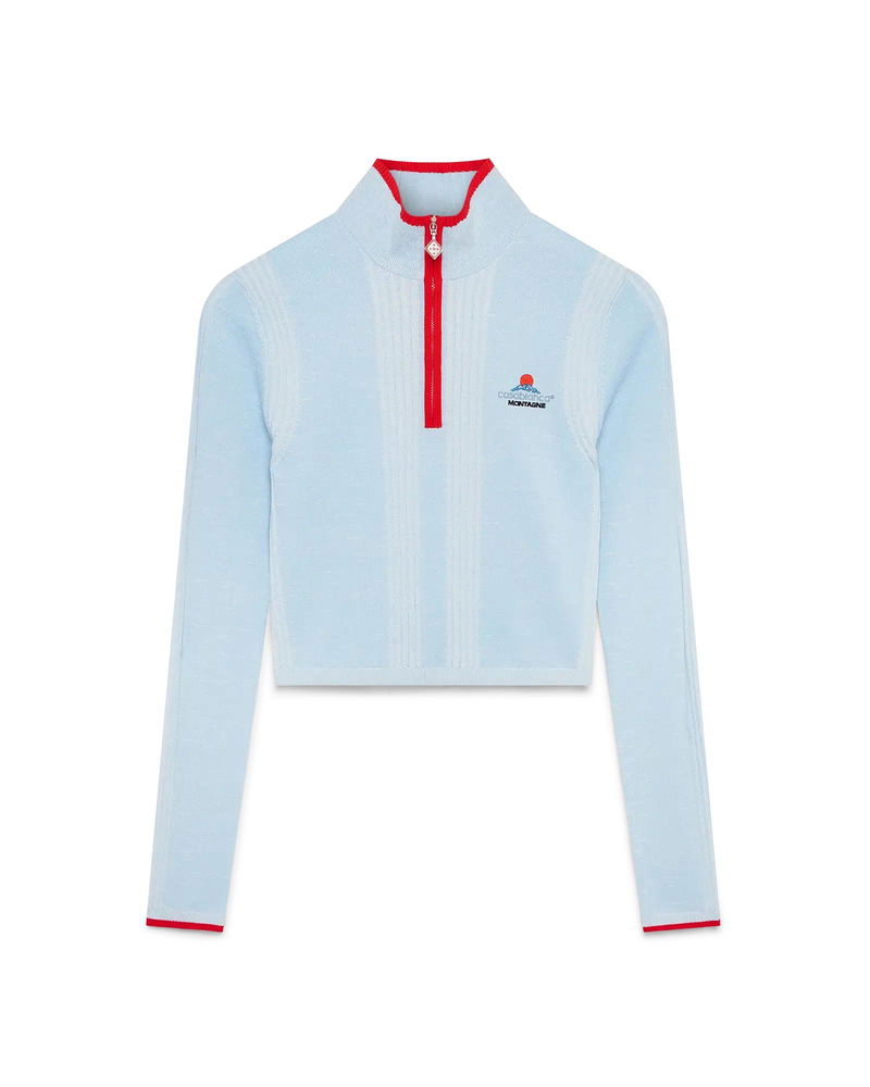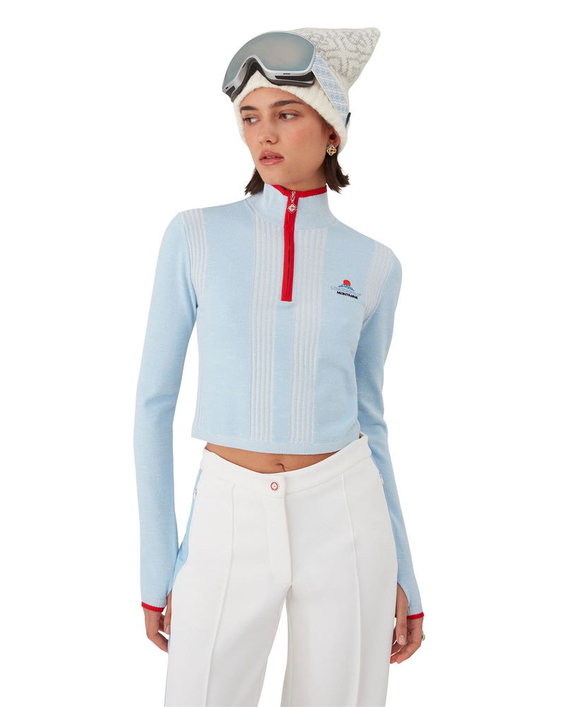 The ski merino base layer crop top is a refined après-sport design crafted from merino wool fabric in blue, inspired by deep twilight settling over Japan's mountainous countryside. Drawing from serene beauty of evening light casting blue shadows across snow-covered valleys, the design blends sport-leisure elegance. Completed with a red contrast zip-up closure that features the house's signature diamond monogram toggles.
