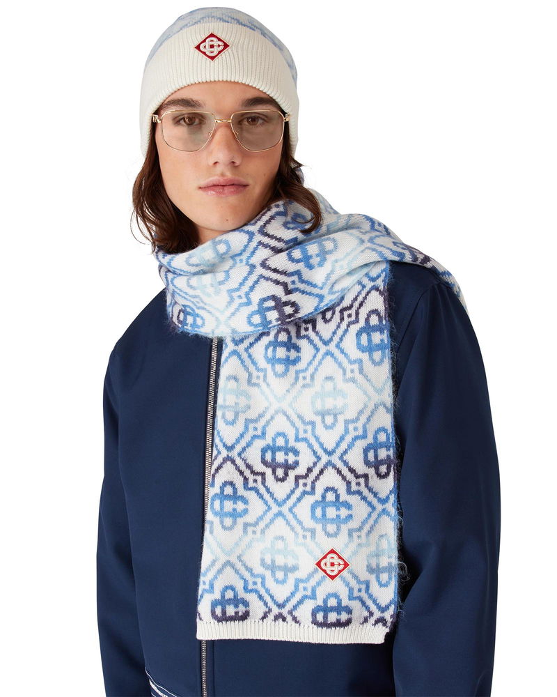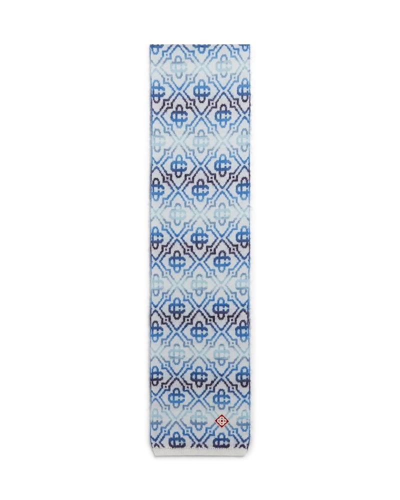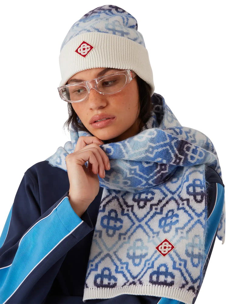 The Space Dye Monogram scarf is crafted from a luxurious wool blend featuring the house's signature diamond monogram crafted from space-dyed yarns that create depth and dimension. Completed with ribbed edge detail. Merino wool blend fabric 59% wool 15% polyamide 13% mohair 13% alpaca Diamond logo patch Colour: white/blue Specialised dry clean only Made in Italy Space Dye Monogram Scarf by Casablanca Paris