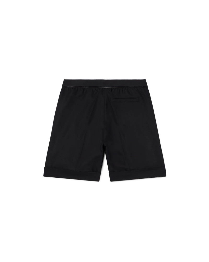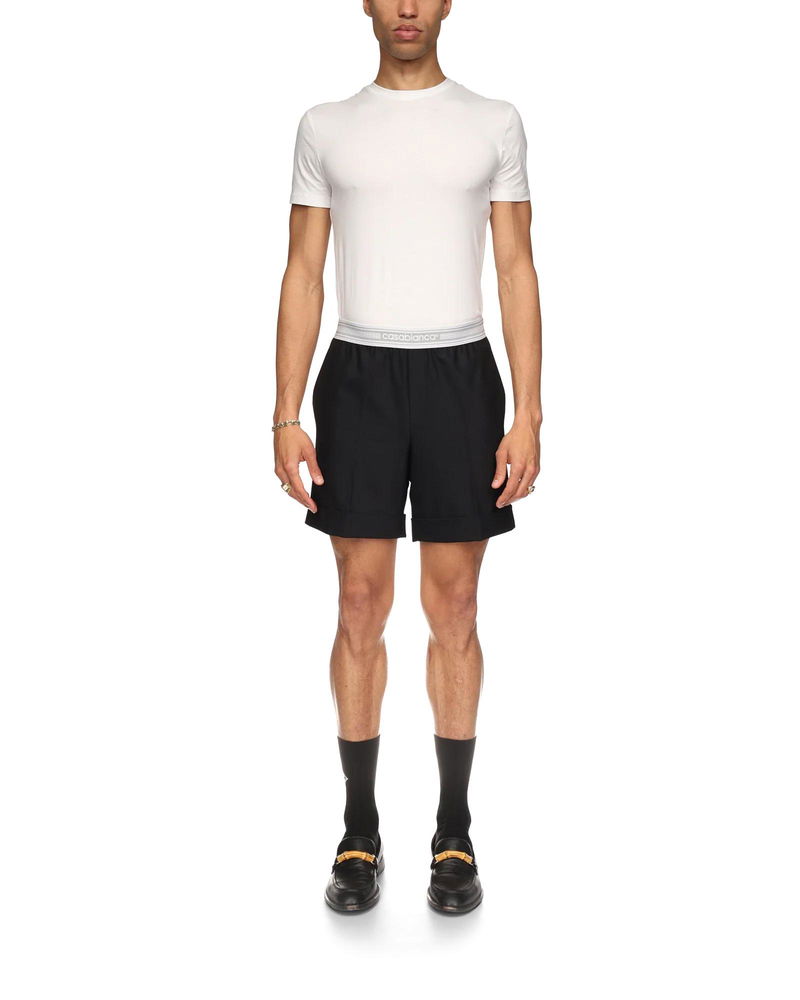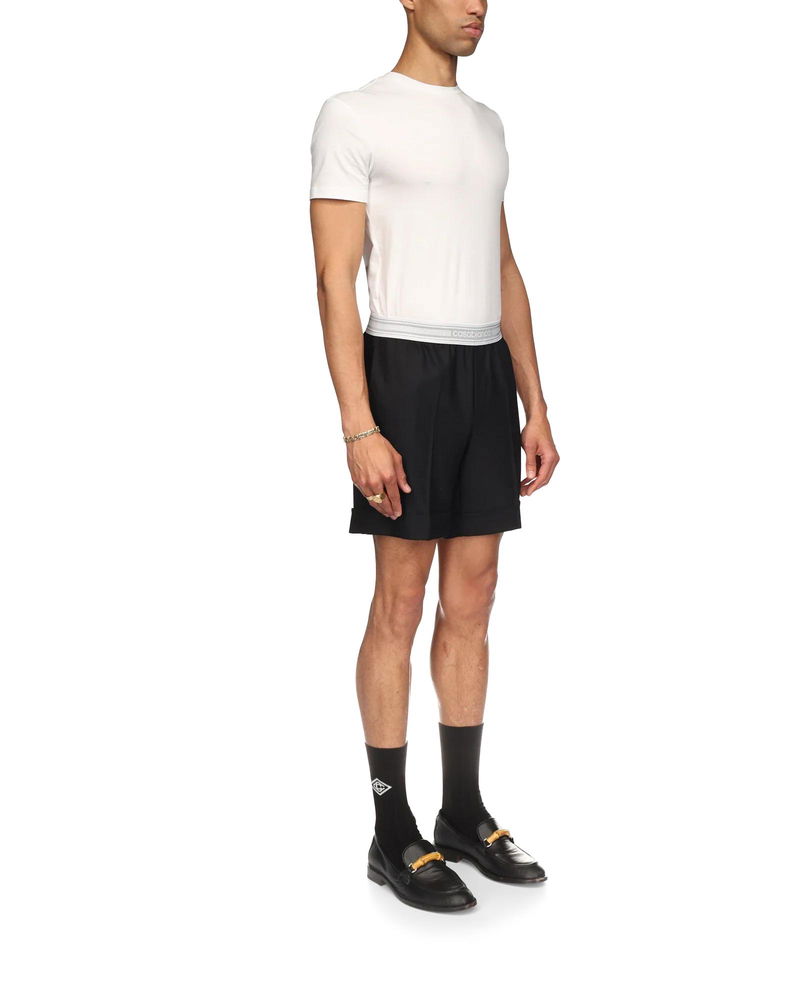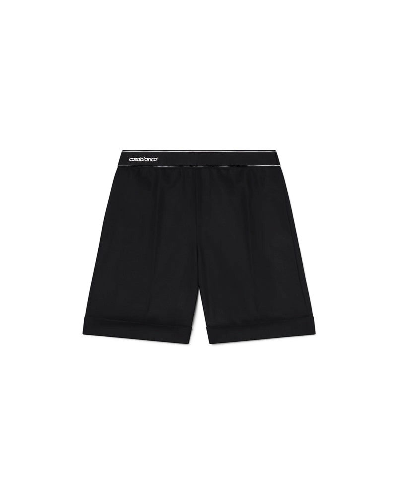The sports tailoring shorts are a tailored design crafted from a wool blend fabric featuring an elasticated tape waistband with the Casablanca logo. Completed with slanted front pockets, a mock front opening, a welt back pocket, and a turn-up hem. Wool blend fabric 53% polyester 43% virgin wool Colour: black Specialised dry clean only Fits true to size, take your regular size The model is 187cm/6'1 and is wearing a size M Sports Tailoring Shorts, Size 48 by Casablanca Paris