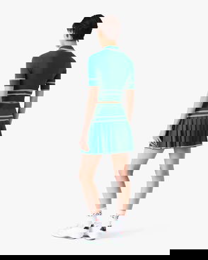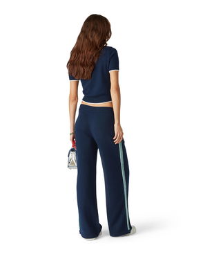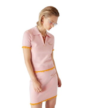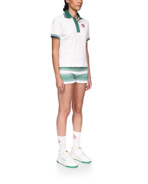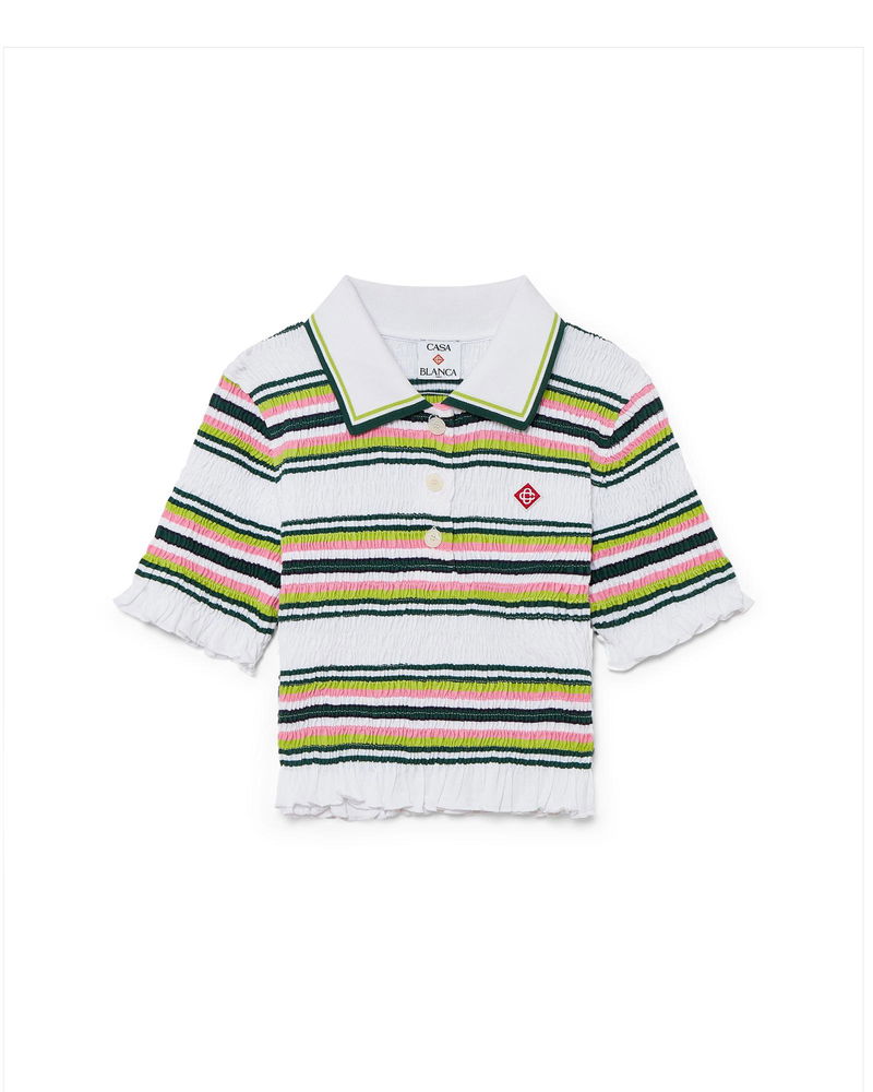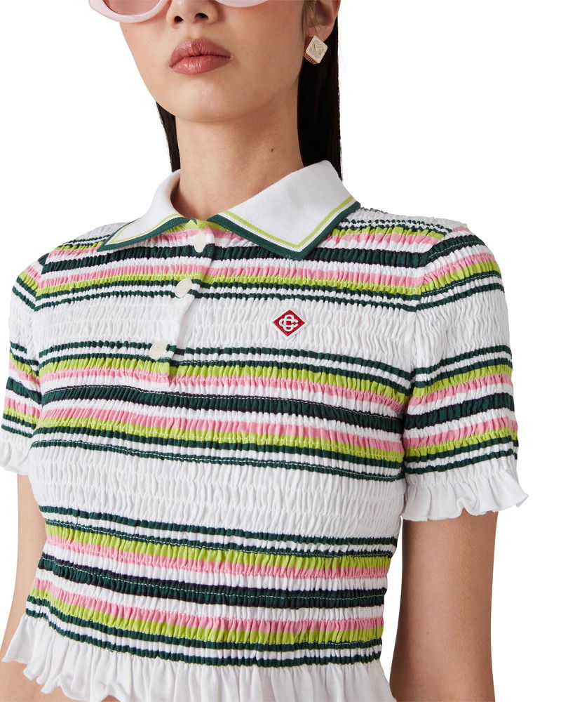 The striped cropped polo shirt is a short style featuring the house's signature diamond logo. Crafted from shirred cotton fabric and completed with a rib collar with striped edge detail, three-button placket closure, short sleeves, and frill details on the cuffs and hem. Designed to fit above the navel.