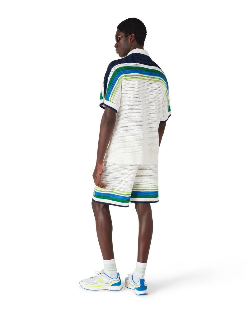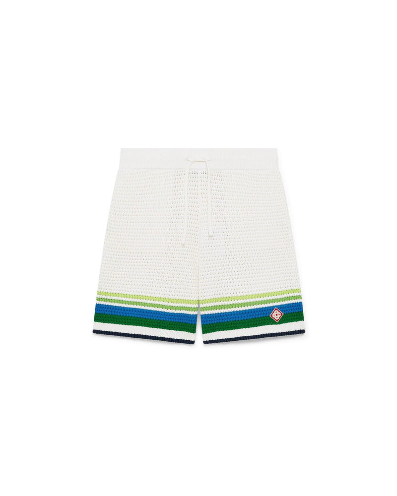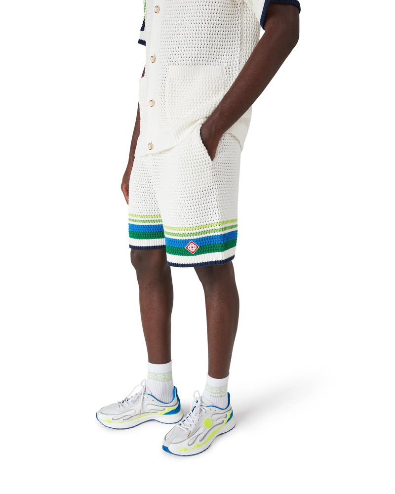 The stripe knit shorts are a refined soft textured design crafted from a crochet cotton fabric, featuring the signature tennis stripe design in natural colours. Finished with a ribbed elasticised waistband with drawstring fastening, side pockets and a relaxed silhouette. Crochet cotton fabric 100% cotton Diamond logo patch Colour: white Specialised dry clean only Made in China Relaxed fit The model is 189cm / 6'2 and is wearing size M Exclusive to casablancaparis. com, our flagship stores and selected retailers Stripe Knitted Shorts, Size XS by Casablanca Paris