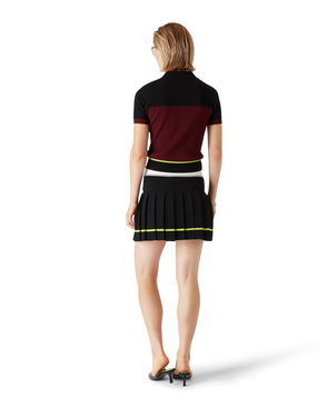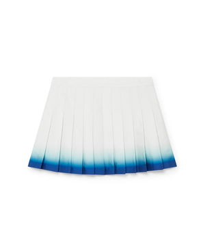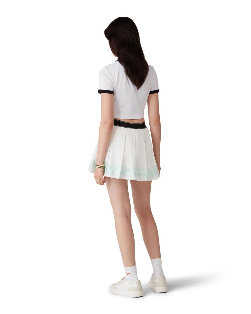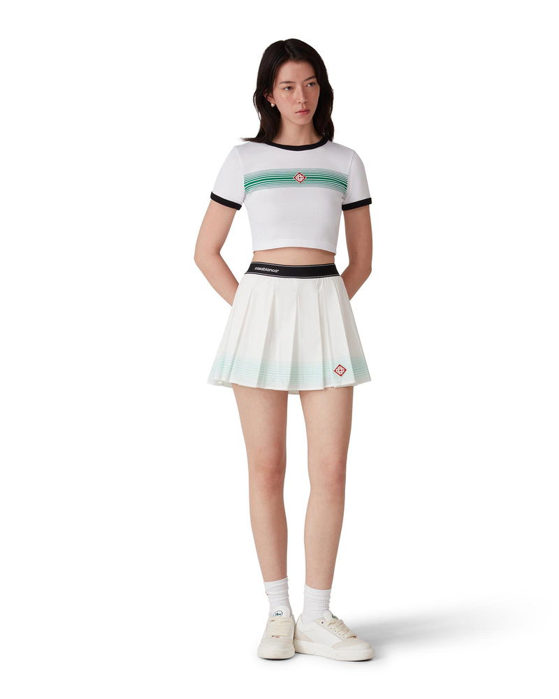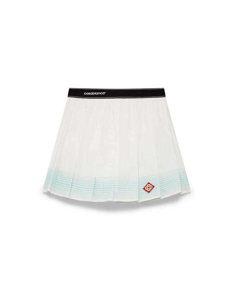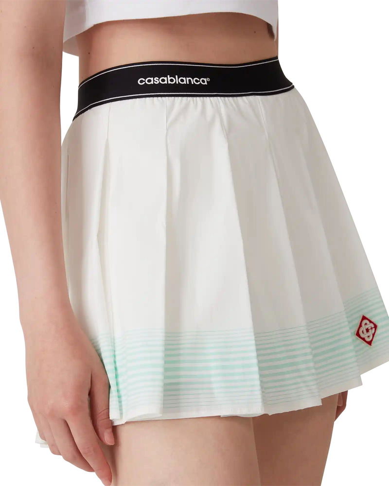 The stripe pleated mini skirt is a short style featuring the house's signature diamond logo. Completed with a contrast elasticised waistband featuring a box print Casablanca logo, a green horizontal gradient stripe hem detail, and fitted under-shorts. Technical stripe fabric.