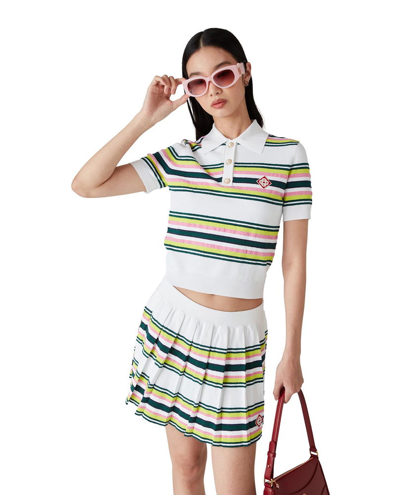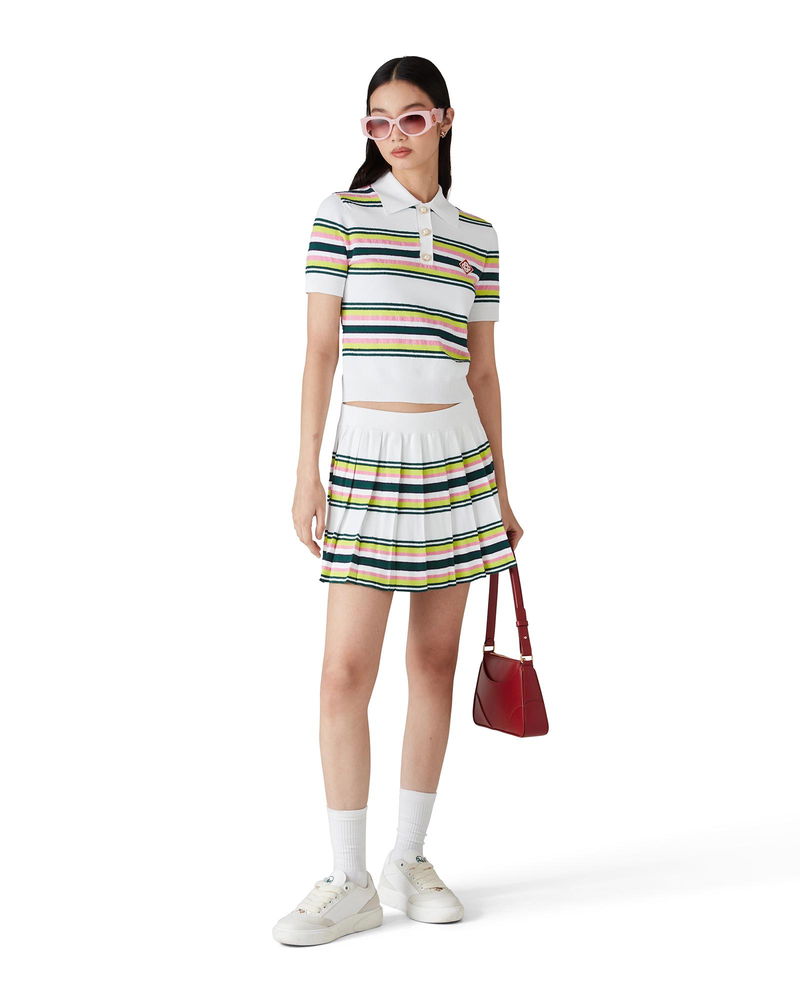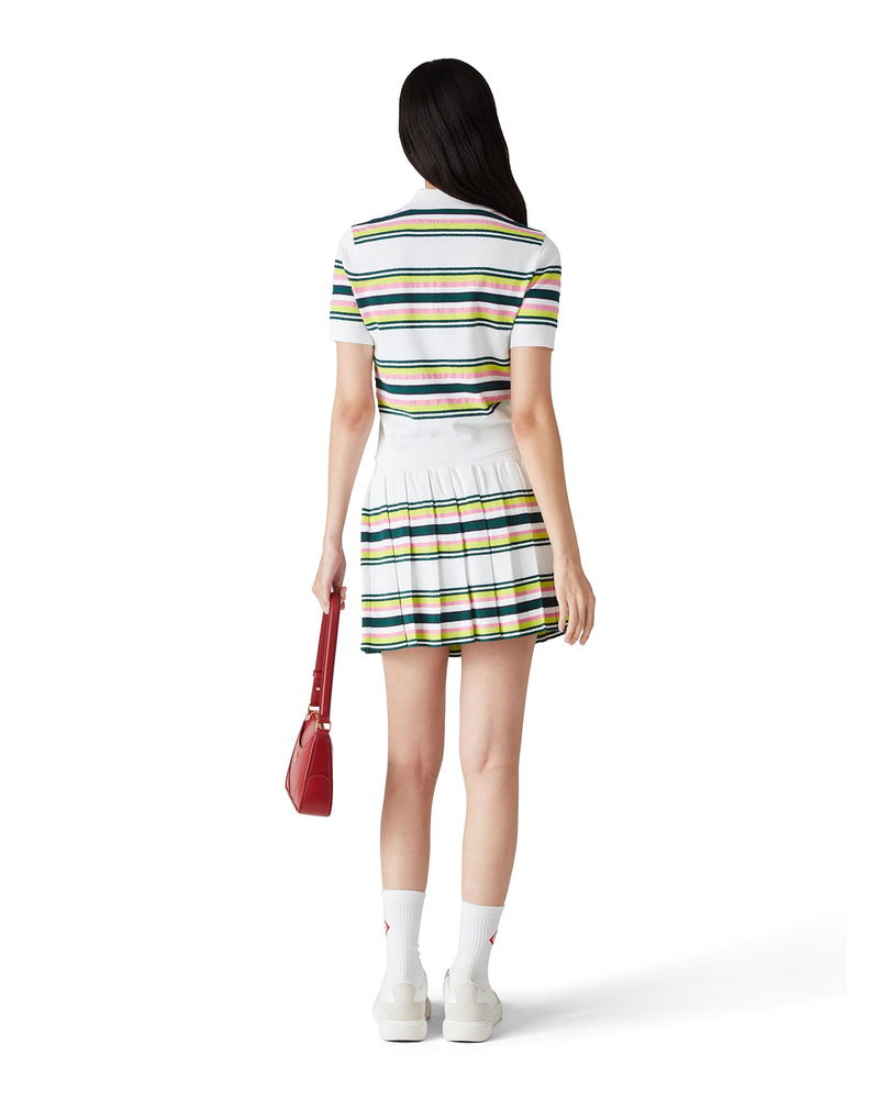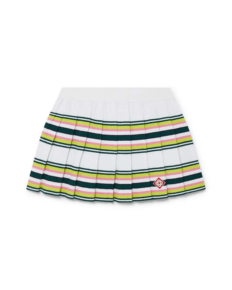 The stripe pleated skirt is a mini-style crafted from a stripe fabric. Completed with an elasticated waistband, pleats, green, pink and blue horizontal stripes, side zip closure, and fitted under-shorts.