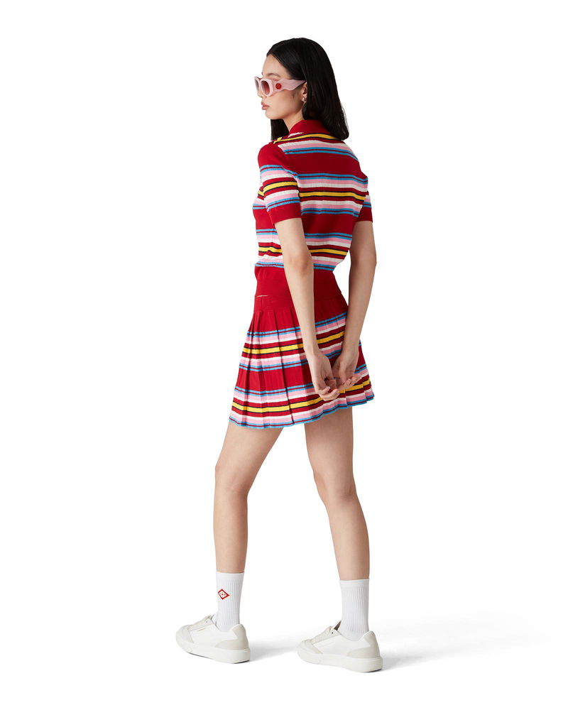The stripe pleated skirt is a mini-style crafted from a stripe fabric. Completed with an elasticated waistband, pleats, green, pink and blue horizontal stripes, side zip closure, and fitted under-shorts.