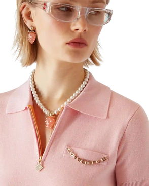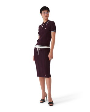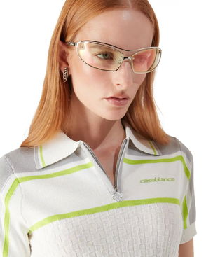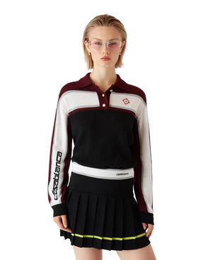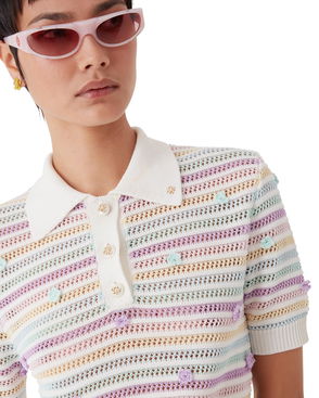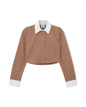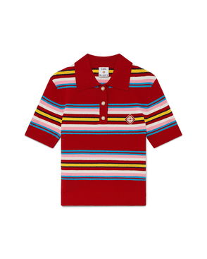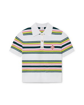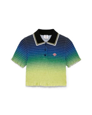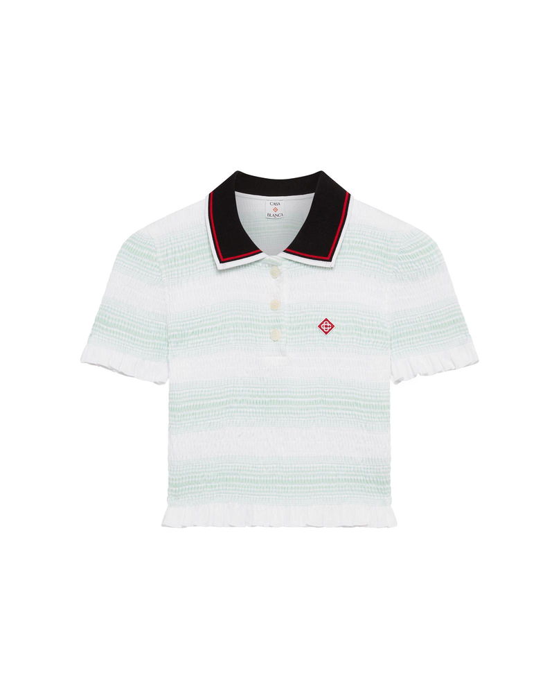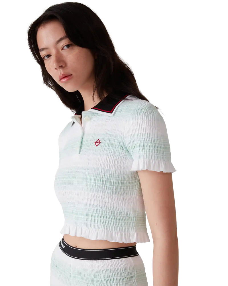 The striped shirred polo shirt is a cropped style featuring the house's signature diamond logo. Crafted from shirred cotton fabric and completed with a rib collar with striped edge detail, three-button placket closure, short sleeves, and frill details on the cuffs and hem. Designed to fit above the navel. Striped shirred cotton fabric.