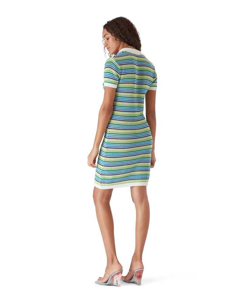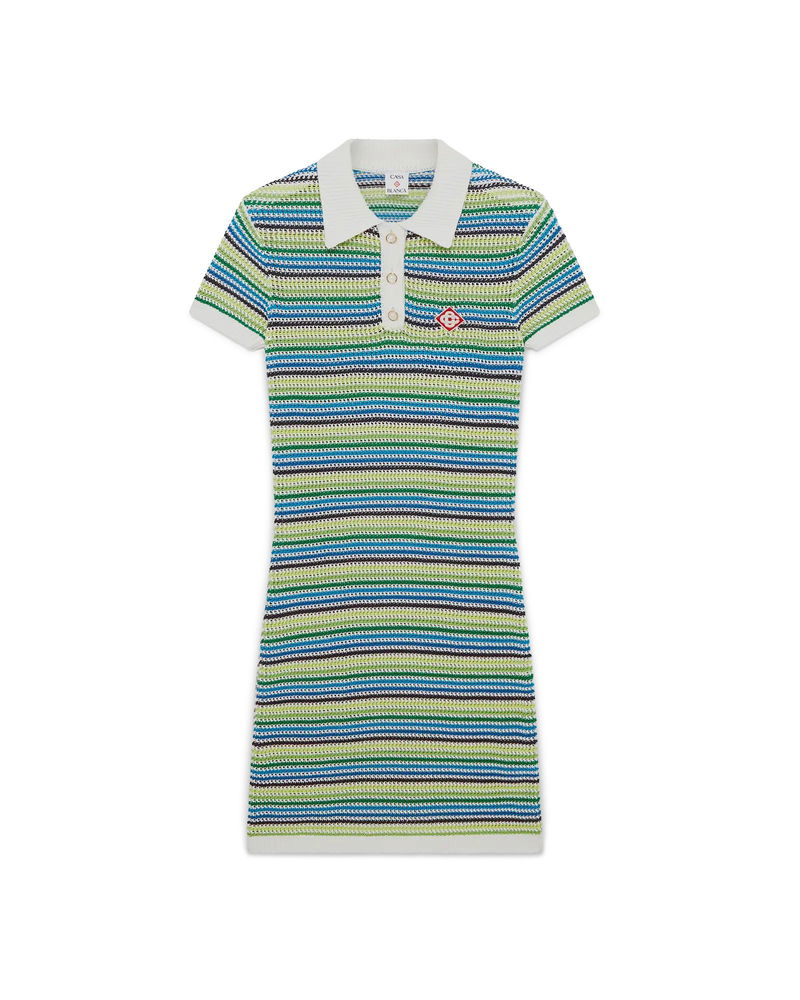 The stripe dress is a mini style design featuring the house's diamond logo collared construction with short sleeves and midi dress silhouette. Completed with the house's signature stripe pattern, diamond logo detailing, and sophisticated knit finishing that captures refined elegance.