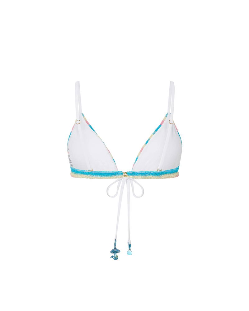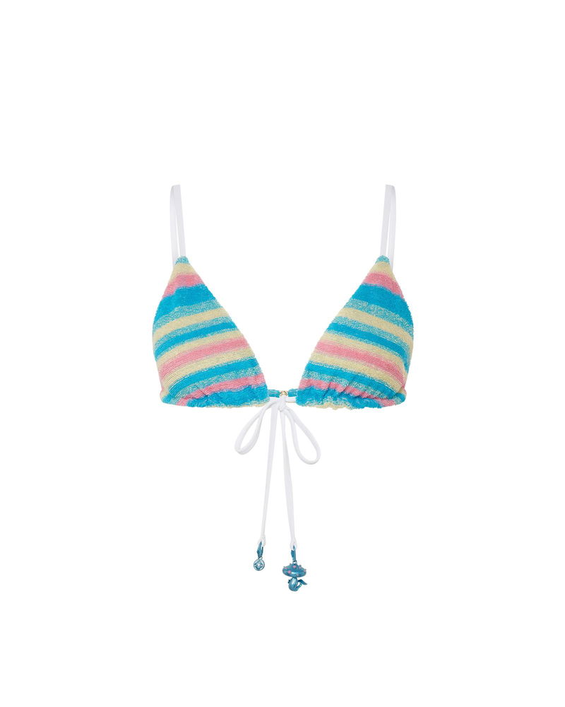 The stripe towelling bikini top is crafted from towelling fabric featuring the house's gold-plated interlocking CC rivet. Completed with a contrast drawstring fastening at the neck and back, finished with the house's seasonal mushroom and CC logo charms.