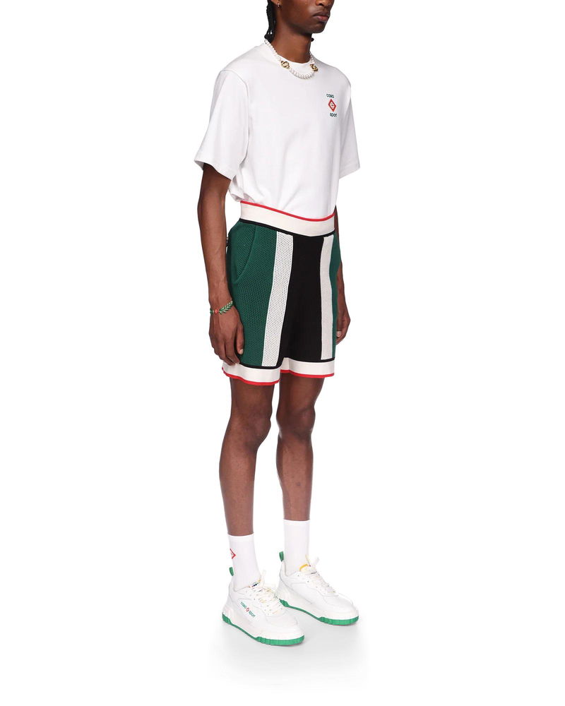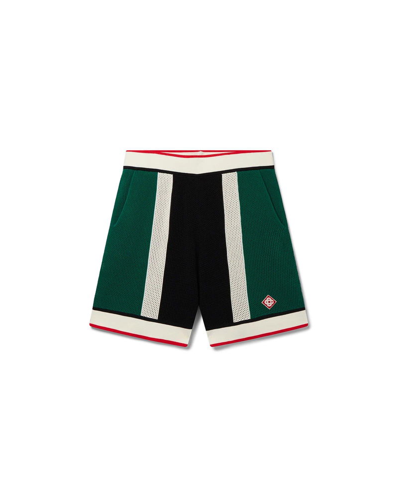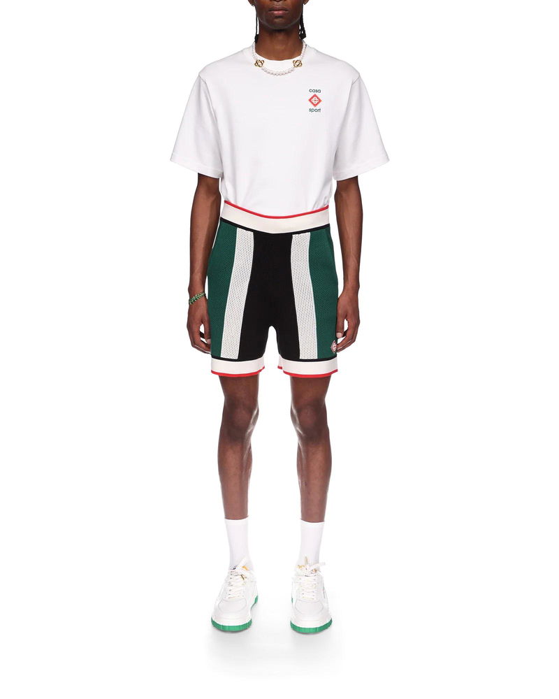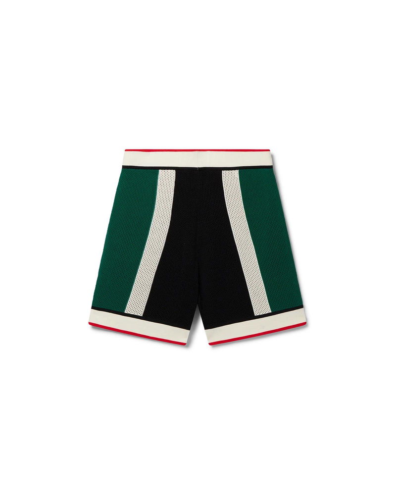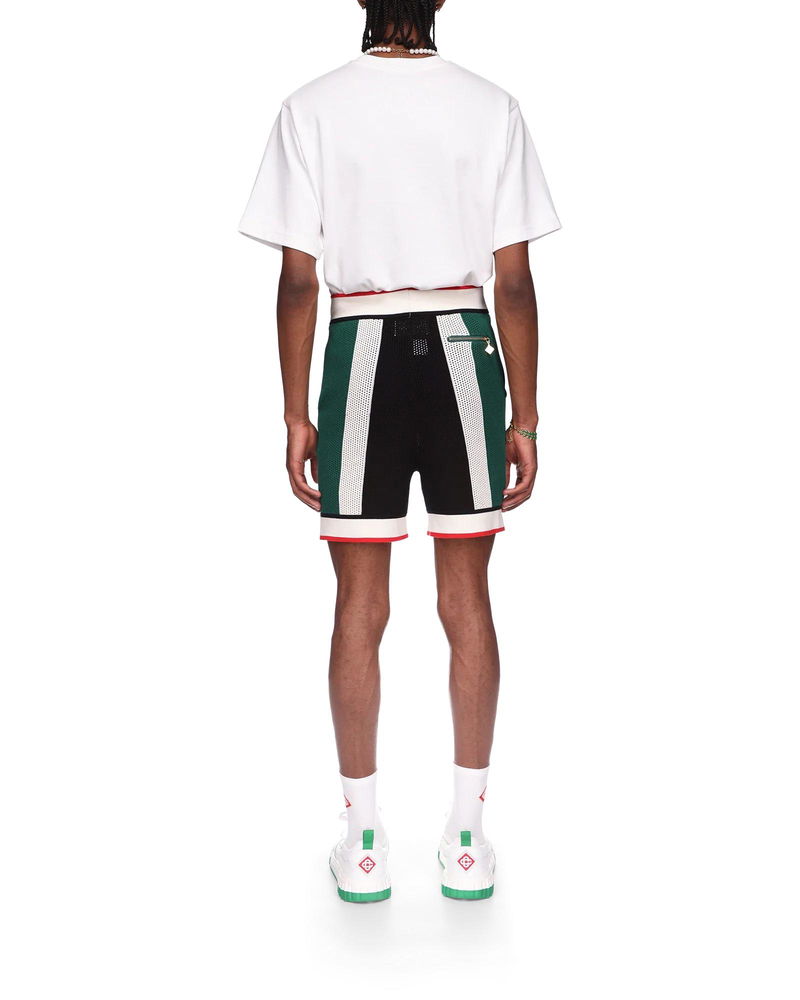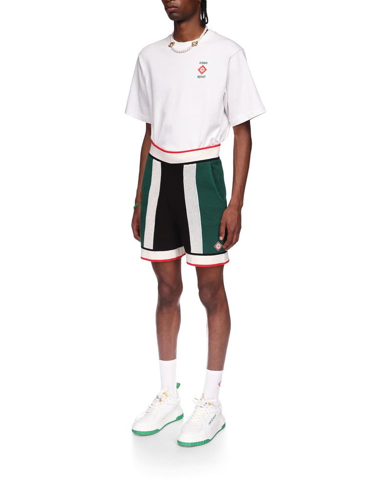 The striped mesh shorts are crafted from a knitted organic cotton fabric, inspired by the colours of the Nigeria flag and feature the house's diamond logo patch. Completed with a ribbed waistband and hem, slanted side pockets and a back pocket with a zip closure. Knitted cotton fabric100% organic cotton Colour: black, white, green, red Specialised dry clean only Fits true to size, take your regular size The model is 186cm/6'1 and is wearing a size S. Made in China Striped Mesh Shorts, Size Small by Casablanca Paris
