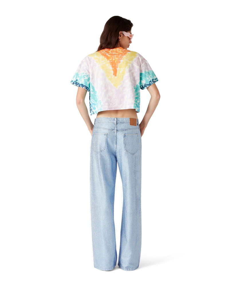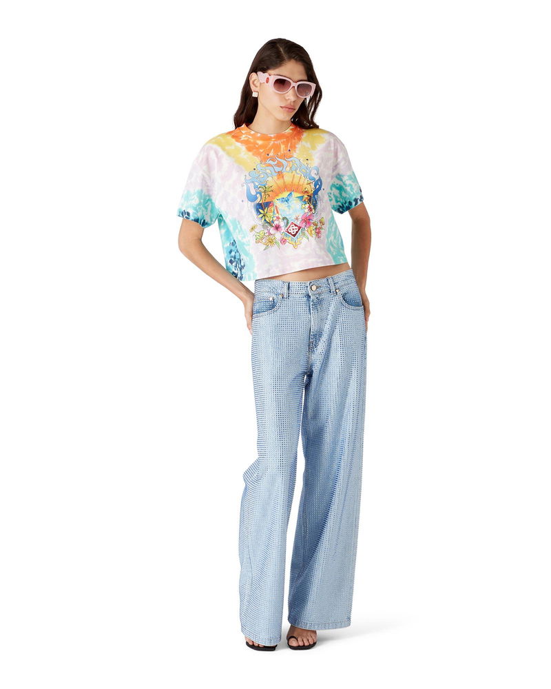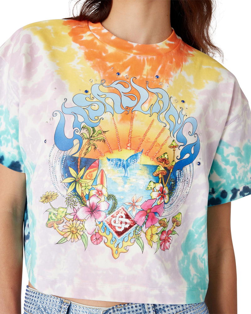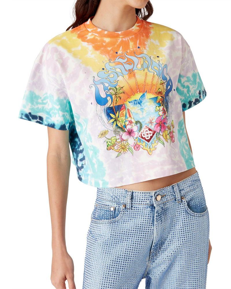 The Surf Trip tie dye t-shirt is a short-sleeve printed design crafted from organic cotton fabric and features seasonal artwork inspired by vintage Malibu surf culture using typography from that era, on a tie-dye backdrop referencing hippy culture.