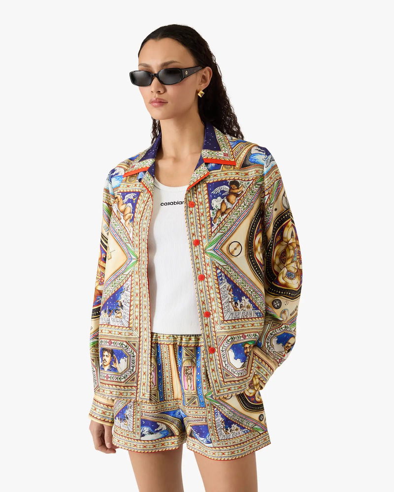The Take Me To Church Cuban collar long-sleeve silk shirt is an all-over printed design, featuring artwork inspired by the elaborate and intricate painted Renaissance ceilings depicting the timeless themes of music and dance.