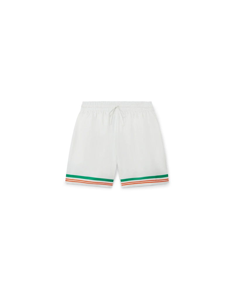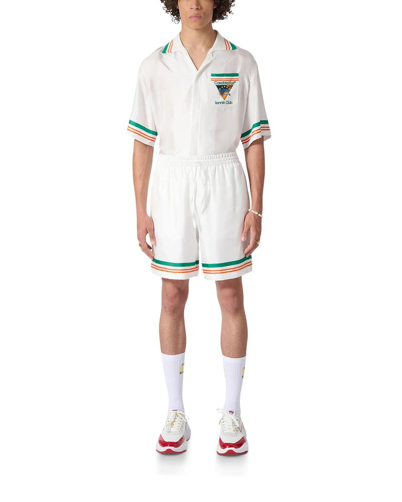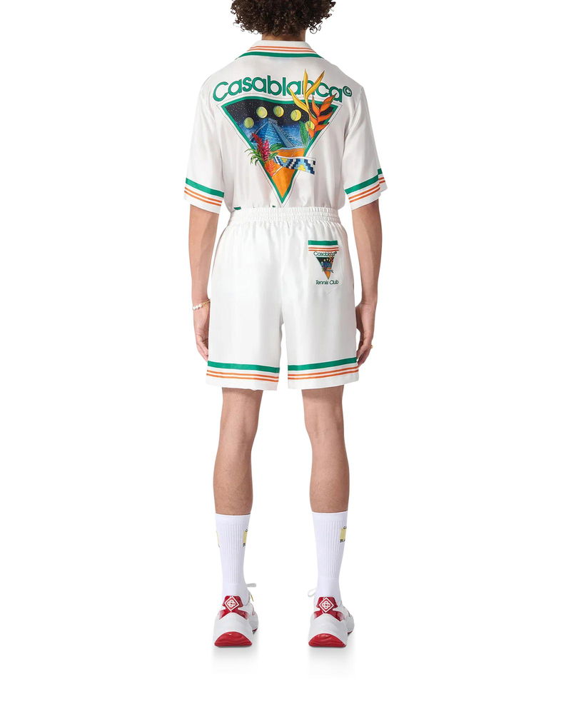 The Tennis Club Icon silk shorts are a louche white style featuring our signature nostalgic artwork on the back pocket. Finished with an elastic waistband, drawstring fastening, and side and back packets to fall loose to above the knee. Printed silk twill fabric 100% silk Tennis Club Icon print white Specialised dry clean only Made in Italy Fits true to size, take your regular size The model is 187cm/6'1 and is wearing a size M Tennis Club Icon Silk Shorts in White, Size Large by Casablanca Paris