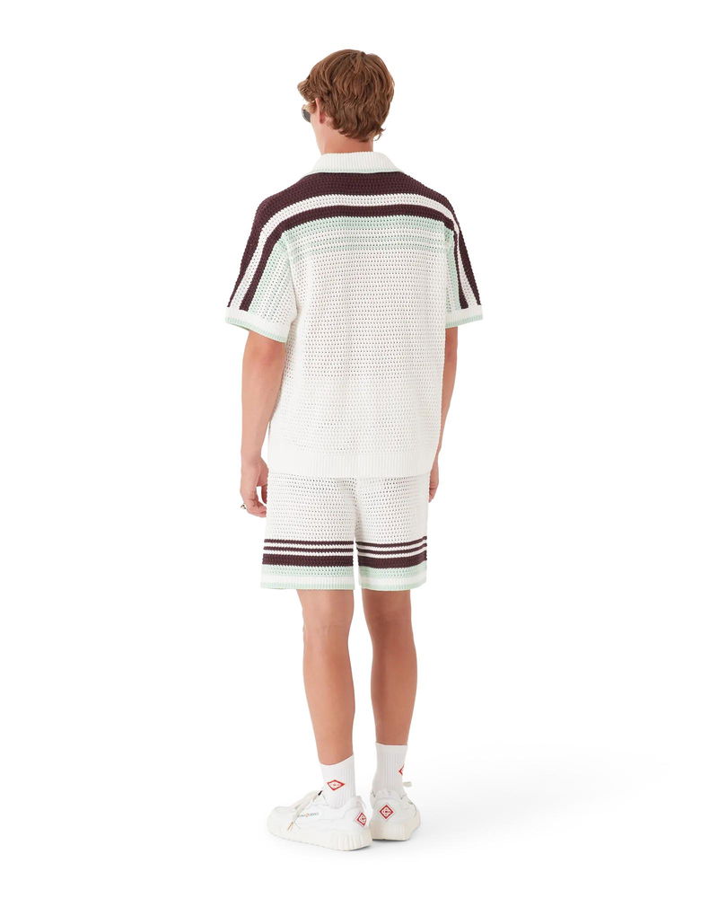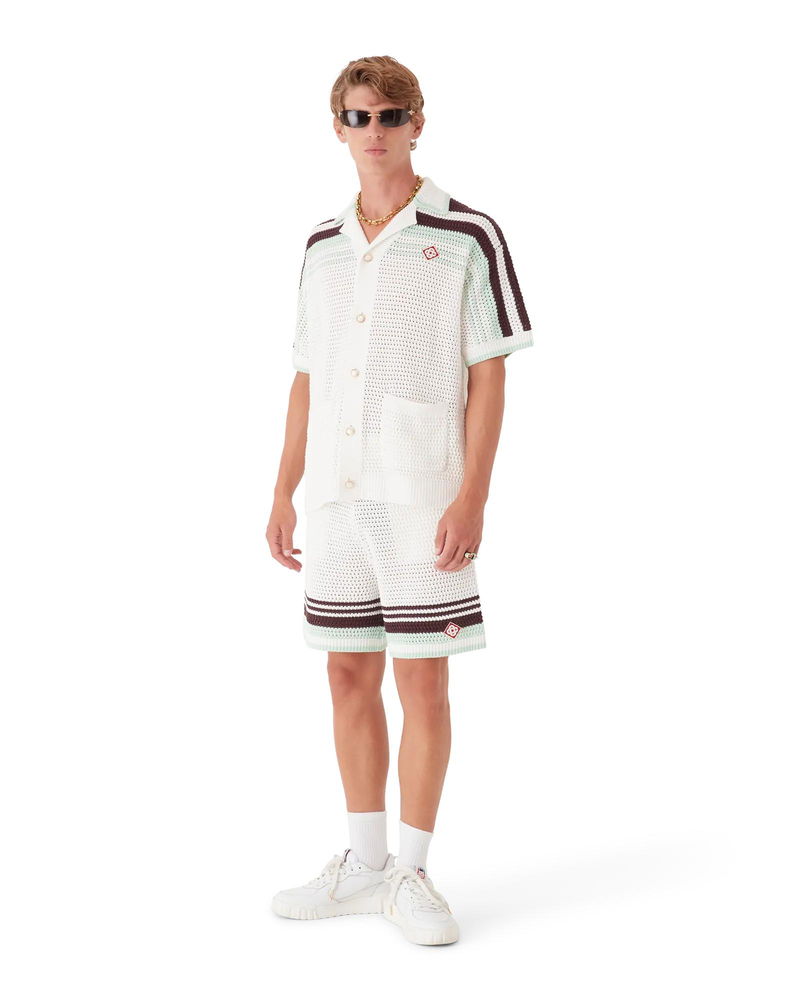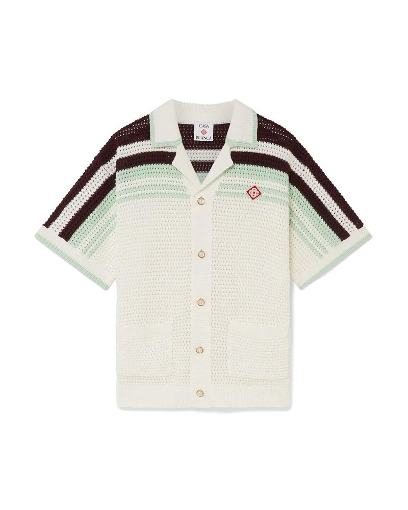 The tennis crochet shirt is a short-sleeve knitted design crafted from crochet cotton fabric in soft natural colours and features the house's signature diamond logo. Completed with signature gold rim pearl buttons, stripe details on the shoulders and down the sleeves, front patch pockets, and striped edge detail on the collar and cuffs. Crochet cotton fabric Main: 100% cotton Appliqué: 95% viscose 5% ethylene vinyl acetate Colour: white/aubergine/mint Specialised dry clean only Made in China Relaxed fit The model is 187cm/6'1 and is wearing a size M Exclusive to casablancaparis. com Tennis Cotton Crochet Short Sleeve Shirt, Size XS by Casablanca Paris