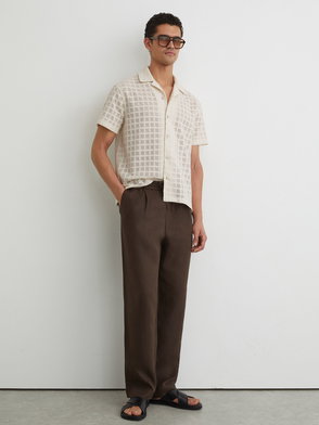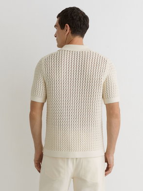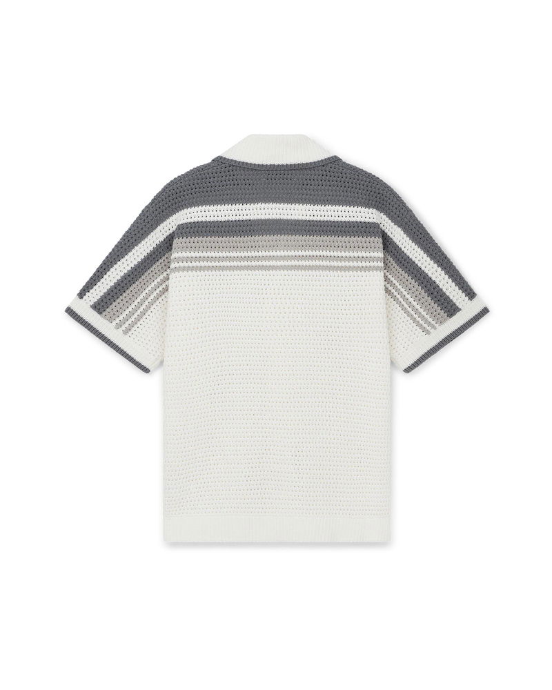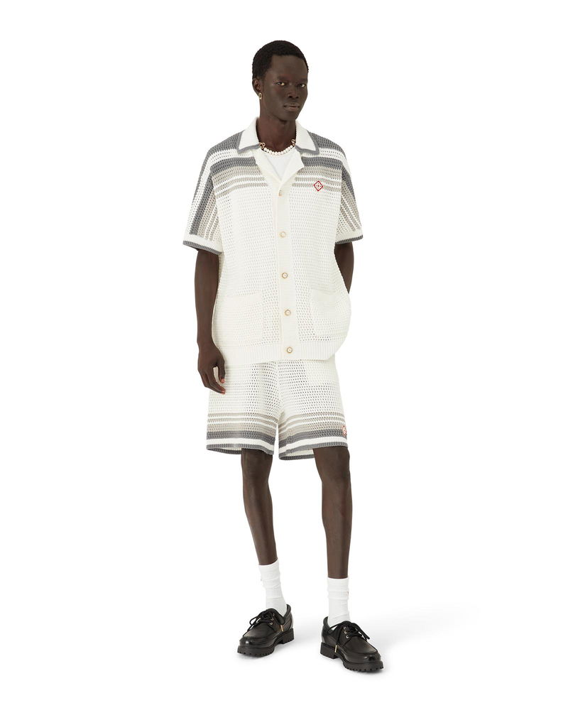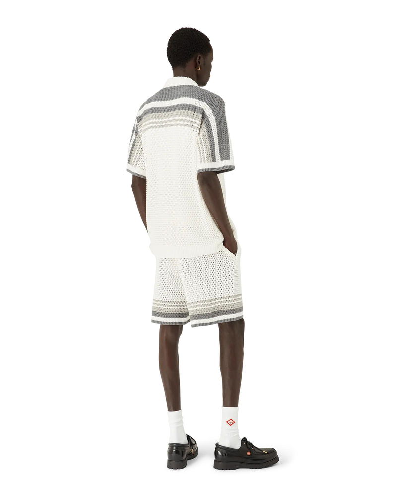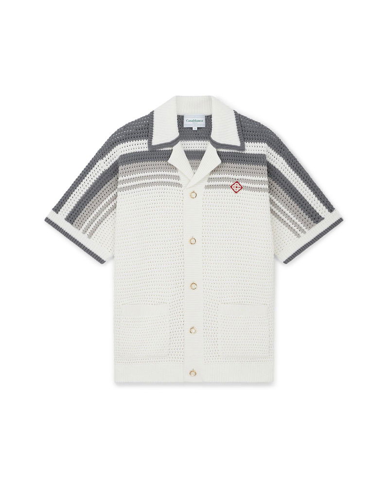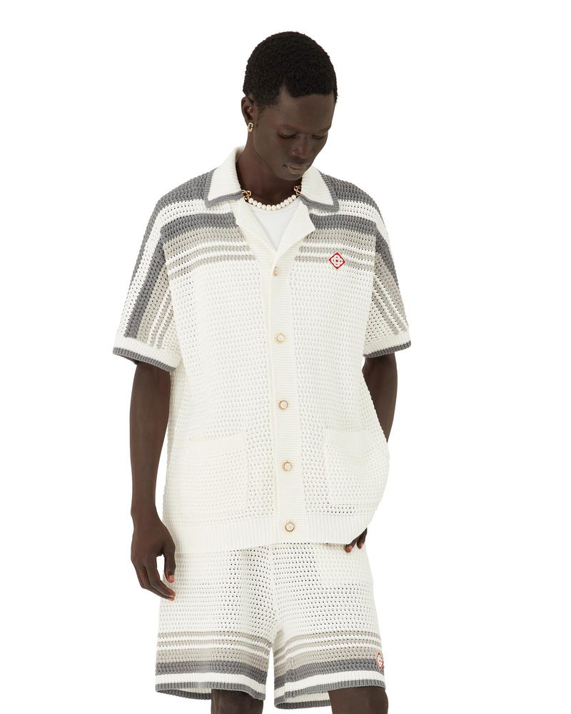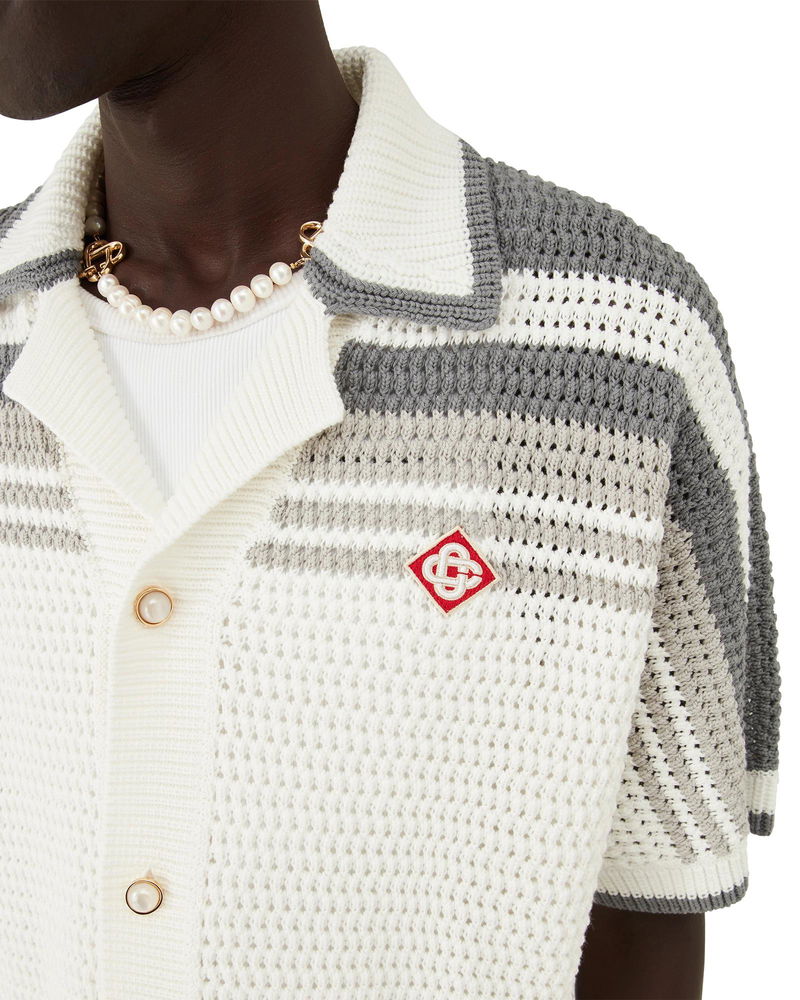 The tennis crochet shirt is a knitted design crafted from a crochet cotton fabric featuring stripe detail across the shoulders, chest and sleeves. Finished with ribbed collar, cuffs and hem with stripe detail, front button closure, front patch pockets and signature gold rim pearl buttons. Cotton knitted fabric 100% cotton Applique: 95% rayon 5% polyester Colour: white, grey Specialised dry clean only Fit true to size, take your regular size Exclusive to casablancaparis. com Tennis Crochet Shirt, Size XS by Casablanca Paris