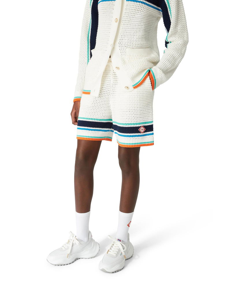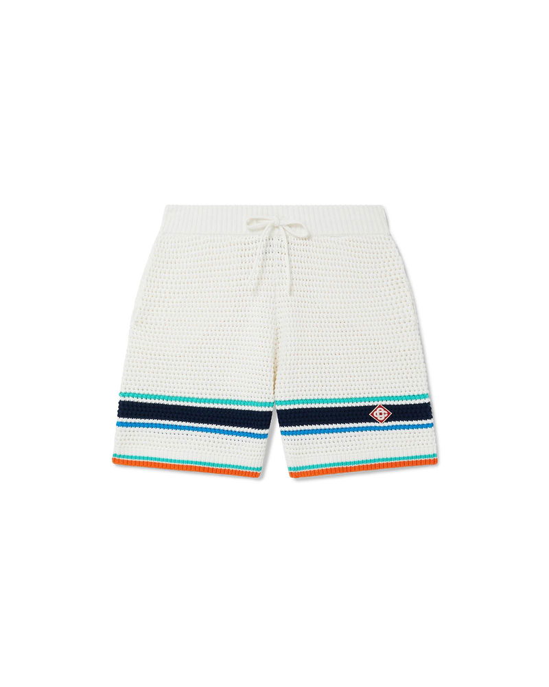 The tennis crochet shorts are a soft textured design crafted from knitted organic cotton fabric, featuring the house's signature diamond logo tying back to the capsule's travel and vacation theme.