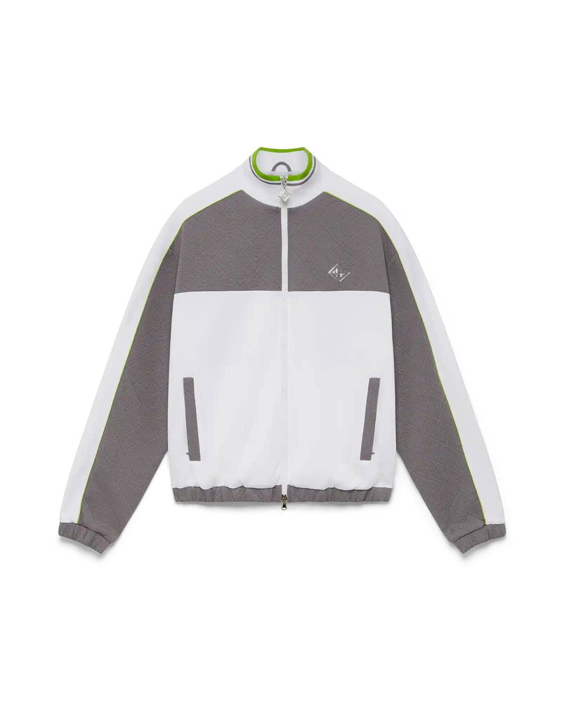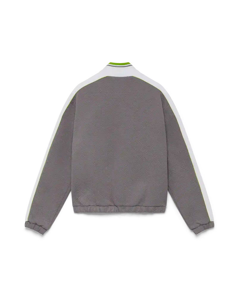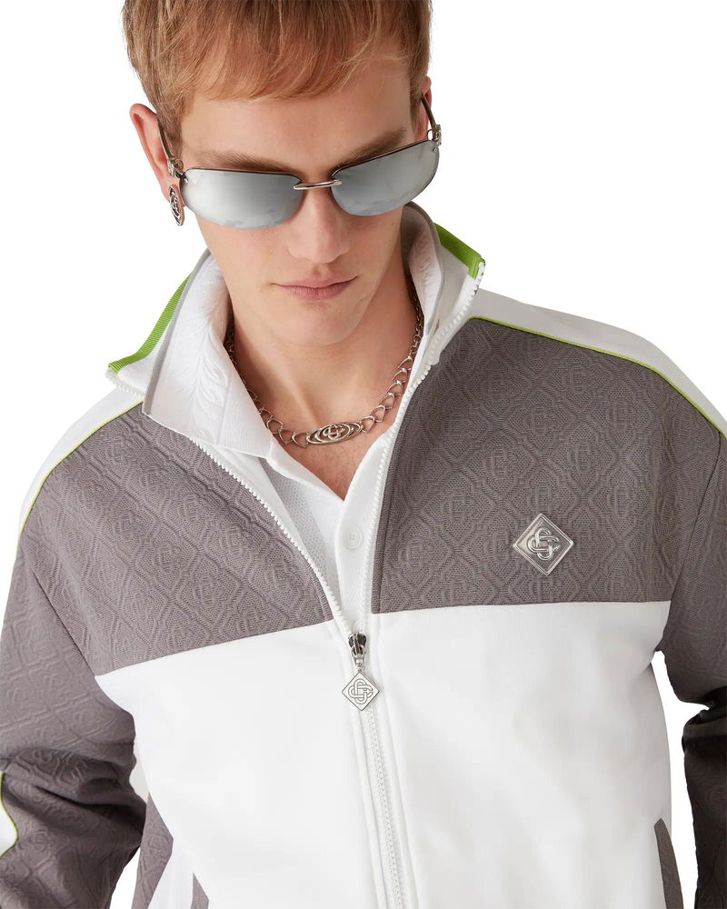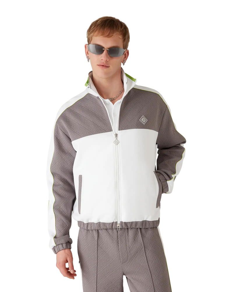 The Tennis jacquard track jacket is a refined design featuring the house's signature diamond logo and monogram fabric crafted with a track jacket silhouette. Completed with a knitted high-collar featuring striped edge detail, a zip closure, vertical welted pockets, stripe and piping details across the shoulders and down the sleeves, and elasticised cuffs and hem. Monogram jacquard fabric 65% polyester 18% polyamide 17% cotton Contrast piping Polyester lining Diamond logo patch Colour: grey/white Specialised dry clean only Made in Portugal The model is 187.5cm/6'2 and is wearing a size M Relaxed fit Tennis Jacquard Track Jacket, Size Medium by Casablanca Paris