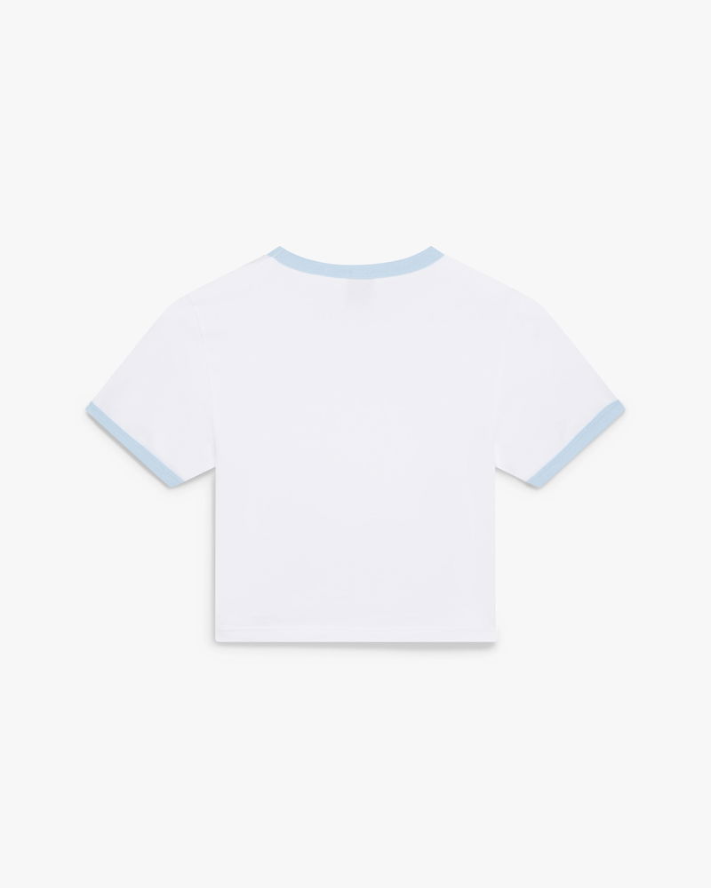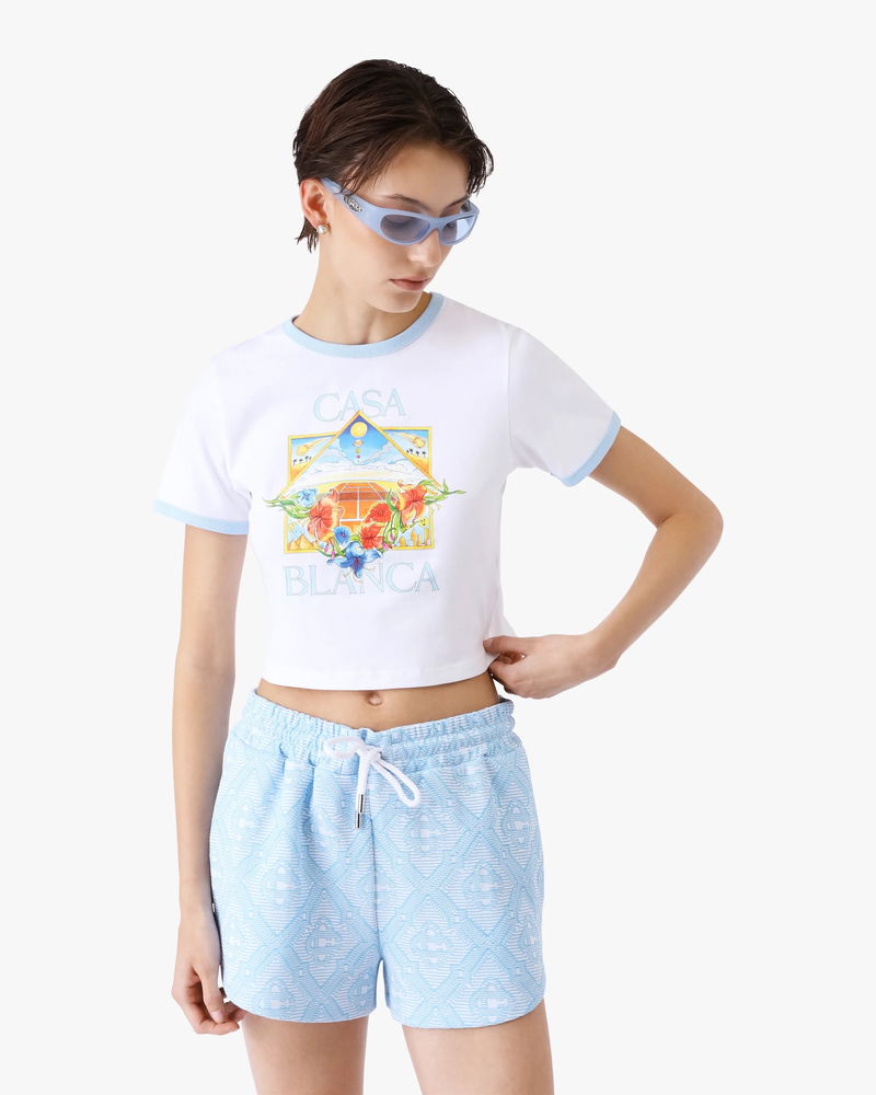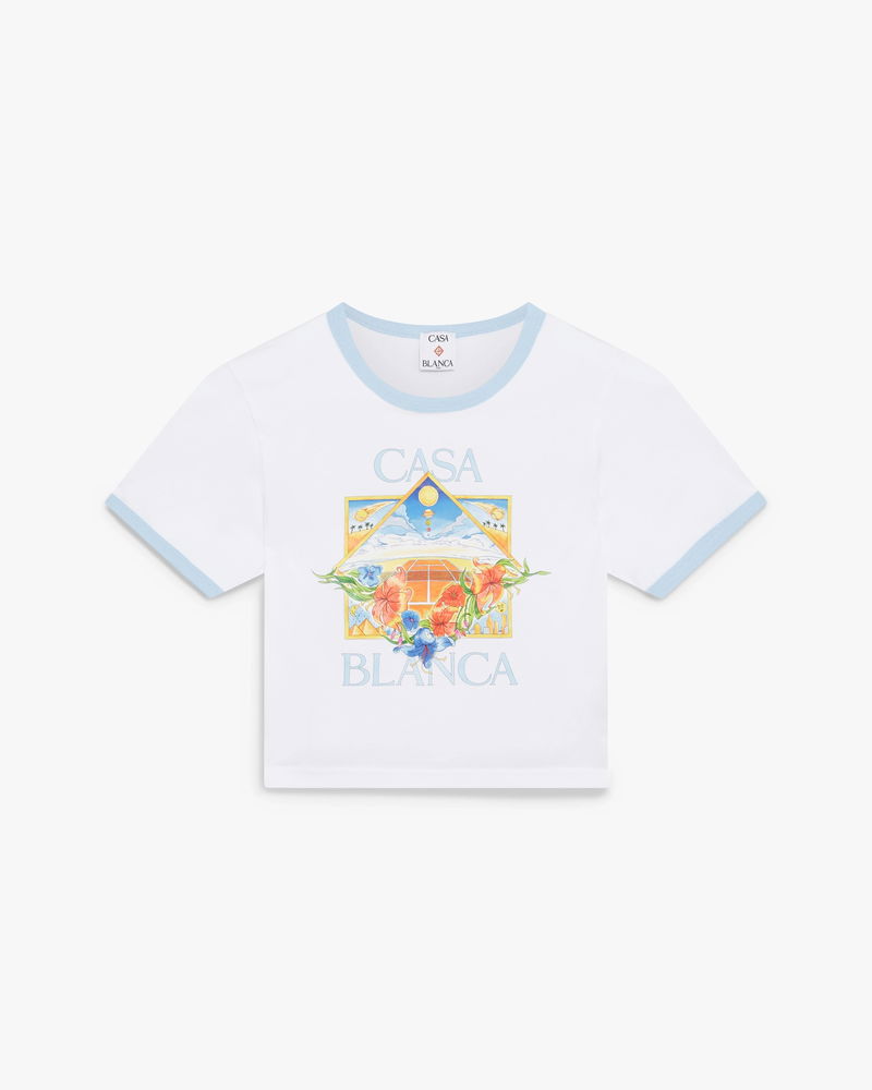 The Tennis Landscape ringer baby short-sleeve t-shirt is a cropped design, featuring the season's Tennis Landscape artwork where interconnecting frames create niches of different scenes that describe transcendence of time and place through the focus of sport. Completed with a crew neckline, contrast ribbed ringer detailing, and a fitted silhouette. Stretch jersey fabric