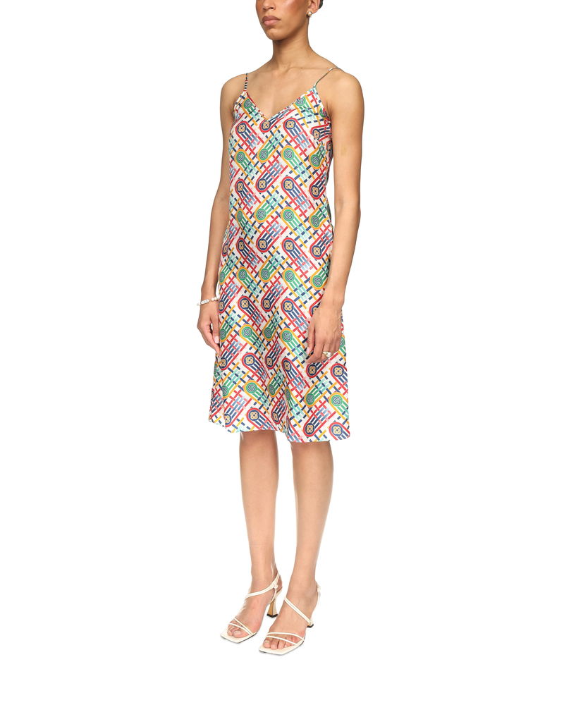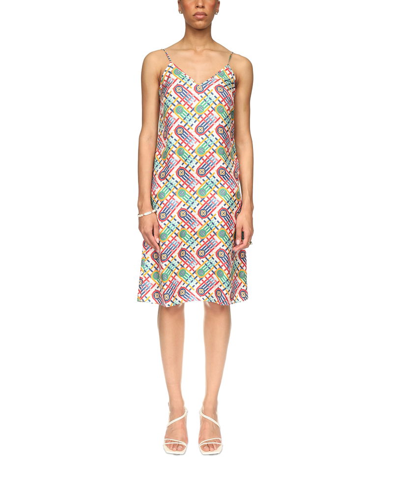 Finished with a spaghetti strap and gentle v-neckline, slightly flaring at the mid-length skirt.