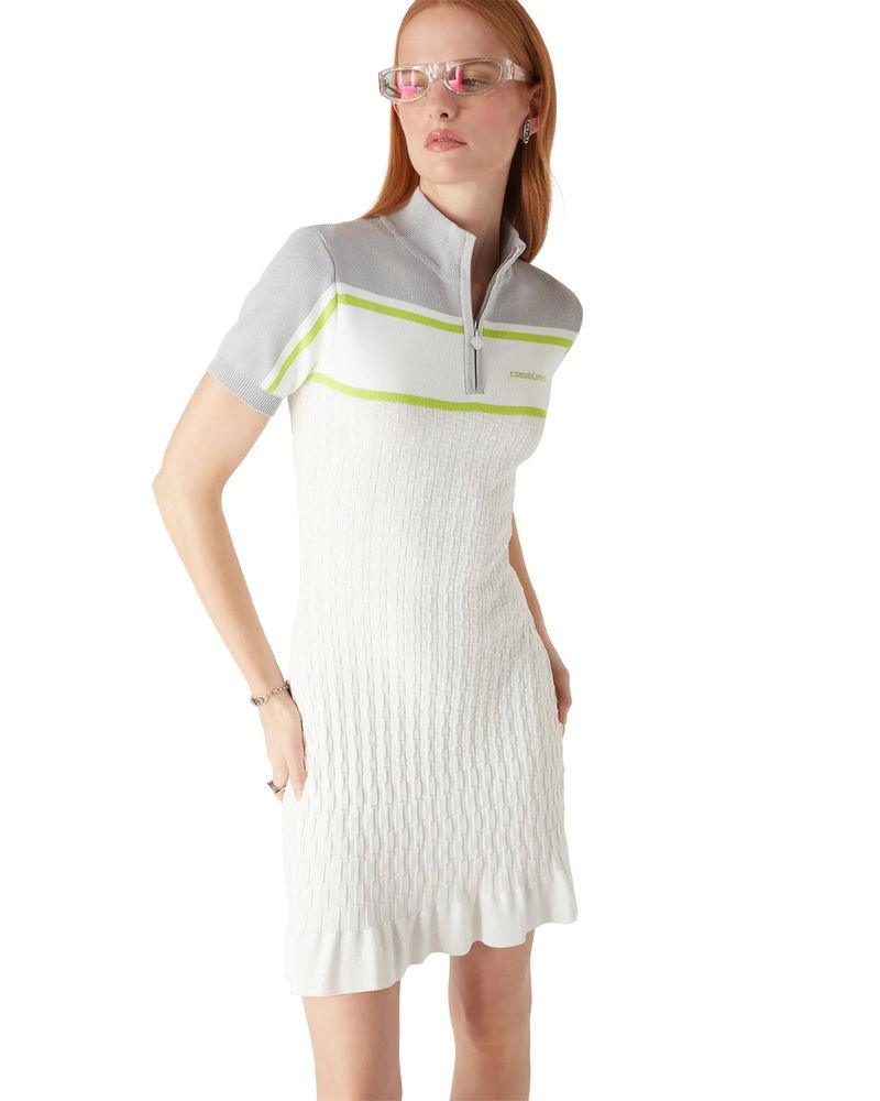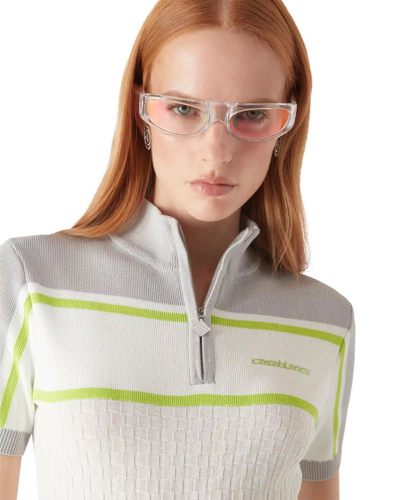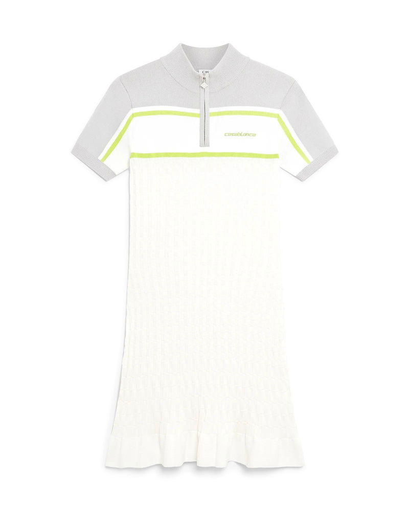 The tennis polo dress is a short-sleeve knitted design featuring contrast shoulders and outer-sleeves. Completed with a zip closure featuring the house's signature diamond logo zipper tab, a high collar, striped detail, signature Casablanca logo, ribbed cuffs, and frill-type hem details.