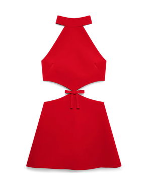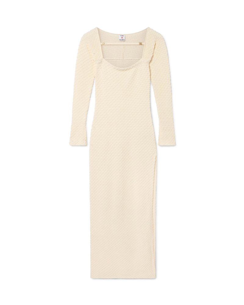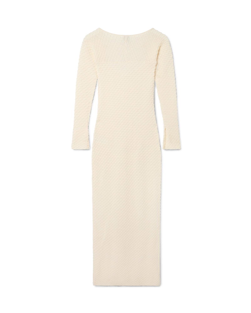 The textured knitted dress is a long-sleeve maxi style crafted from cotton blend fabric. Completed with a boat neckline, slitted sleeves, and hem to thigh slit.
