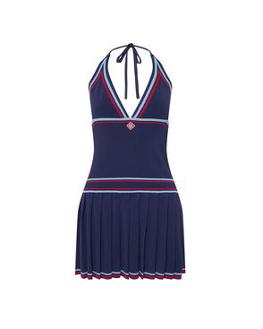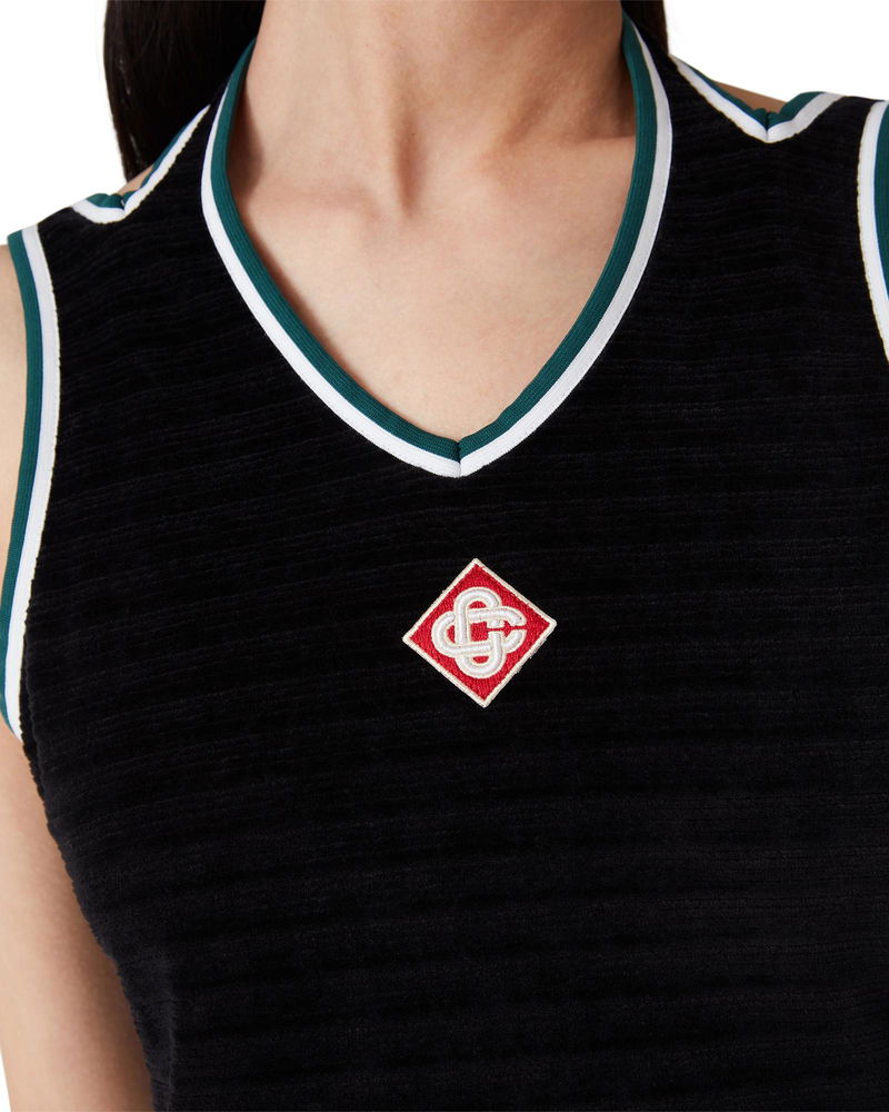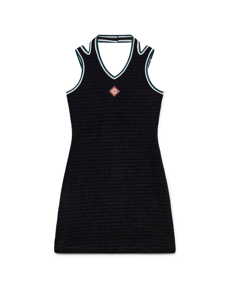 The textured velour tennis dress is an A-line mini design crafted from velour fabric. Completed with a v-shaped halter neck, shoulder straps with a deep scooped back, and the house's signature diamond logo on the chest. Velour fabric.