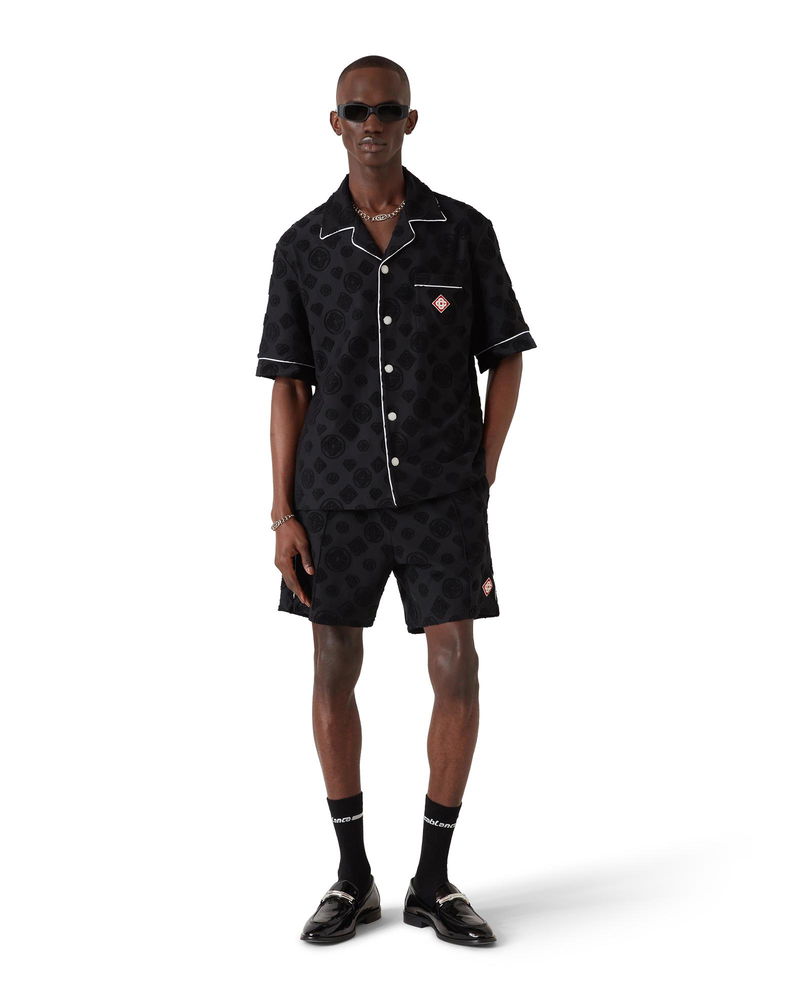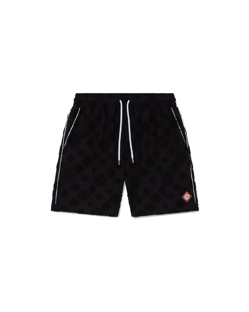 The towelling monogram shorts are a refined design featuring the house's Icon Monogram print. Completed with an elasticised waistband, gold-tipped drawstring fastening, pin tuck seams down the front, a back pocket, slanted side pockets, and piping details on the back and front pockets and down the sides. Monogram towelling fabric 81% cotton 17% polyamide 2% elastane Contrast: 100% polyester Diamond logo patch Colour: black Specialised dry clean only Made in Portugal The model is 187cm/6'1.5 and is wearing a size M Relaxed fit Towelling Monogram Shorts, Size XS by Casablanca Paris