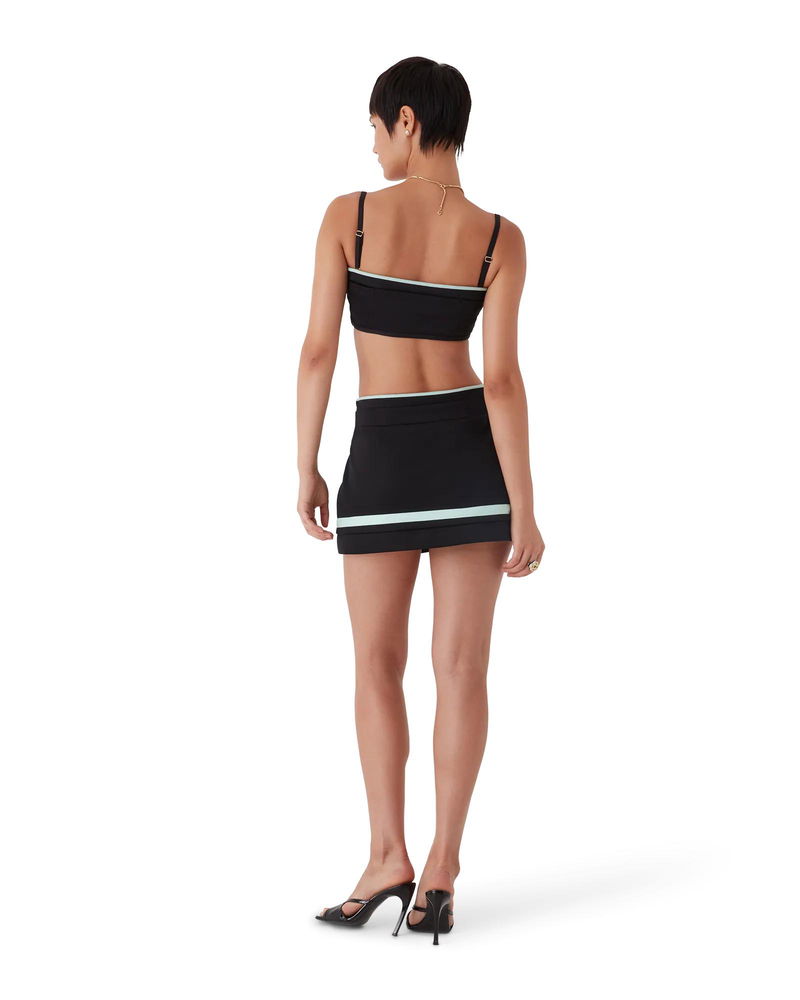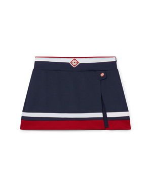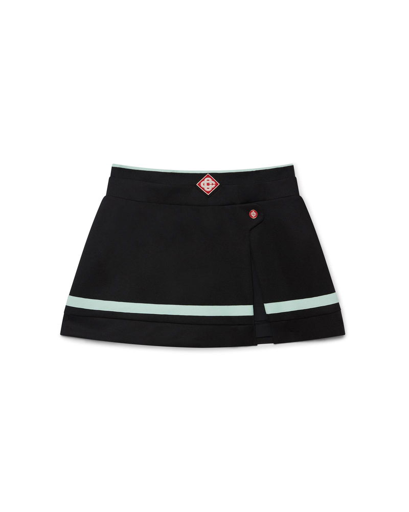 The tricot mini skirt is a short style sportswear-inspired design featuring the house's signature diamond monogram at its centre. Completed with a knitted rib waistband, a flat shank CC logo button, fitted under shorts, a slit, a black, white, mint and red horizontal striped hem detail and side zip closure.