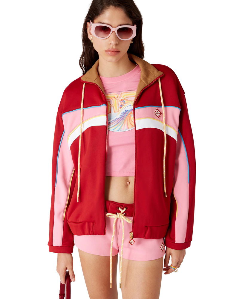 The tricot oversized track jacket is a long-sleeve sportswear design crafted from tricot fabric. Completed with a funnel neck, drawstring fastening, zip closure, and elasticated cuffs and hem.