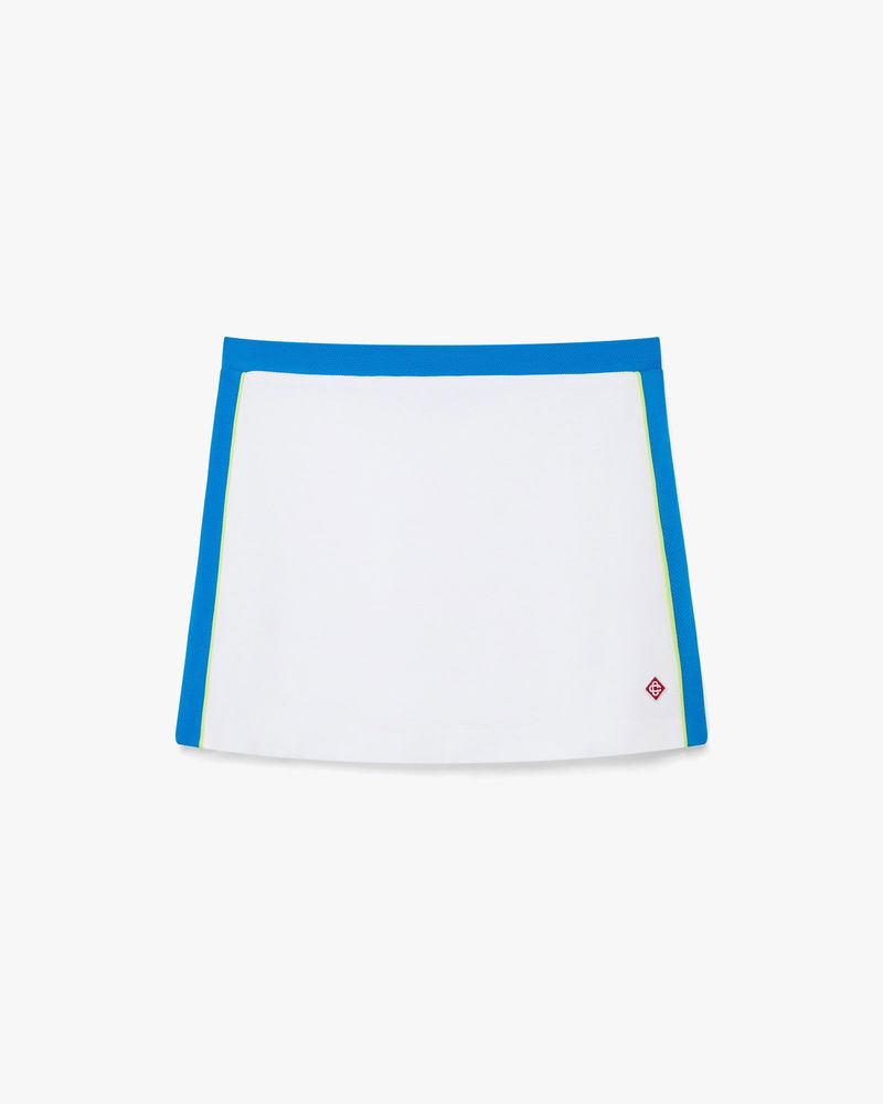 The white and blue pique mini skirt is a refined design featuring the signature diamond logo and embodying the house's elevated approach to sport-leisure.