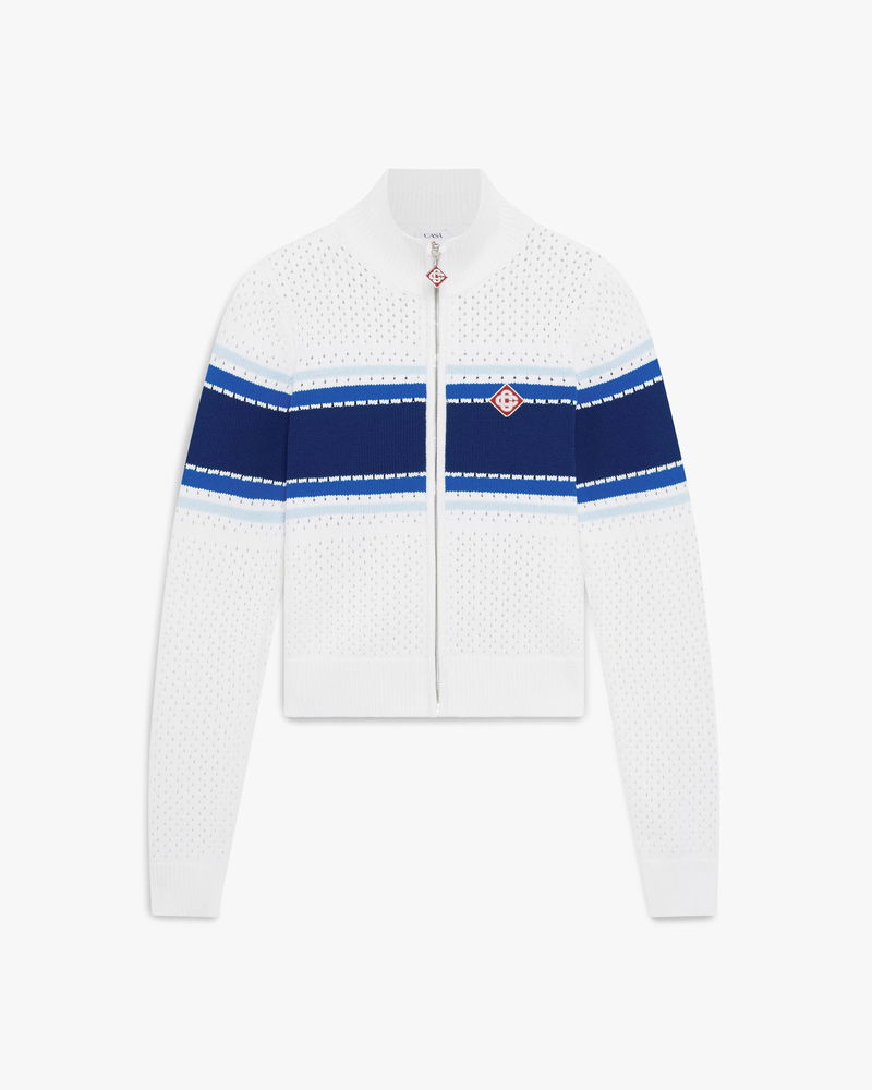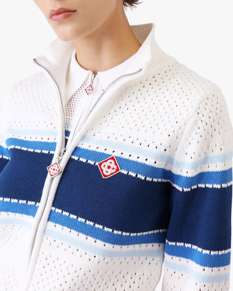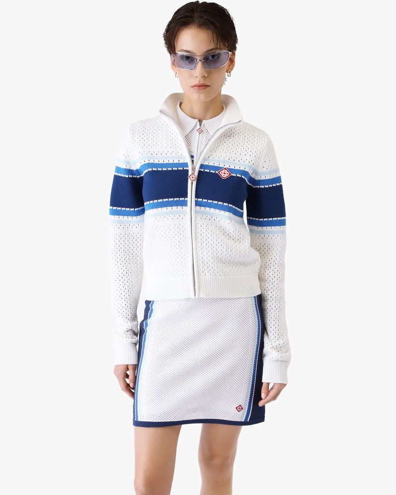 The white and blue striped mesh bomber jacket is a refined knitted design, featuring a blue stripe across the chest, and back. Completed with the house's signature diamond logo, a classic rib collar with stripe edge detail, a zip closure, elasticised cuffs and hem, and a relaxed silhouette embodying the house's elevated approach to sport-leisure.