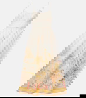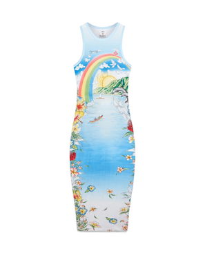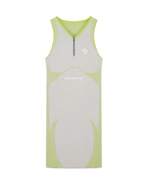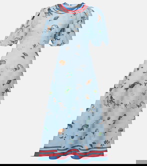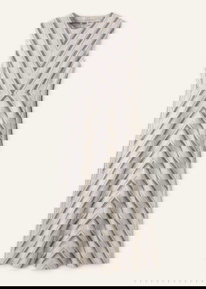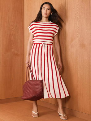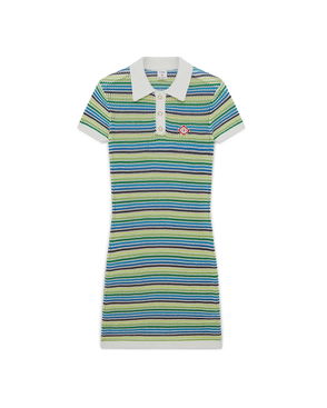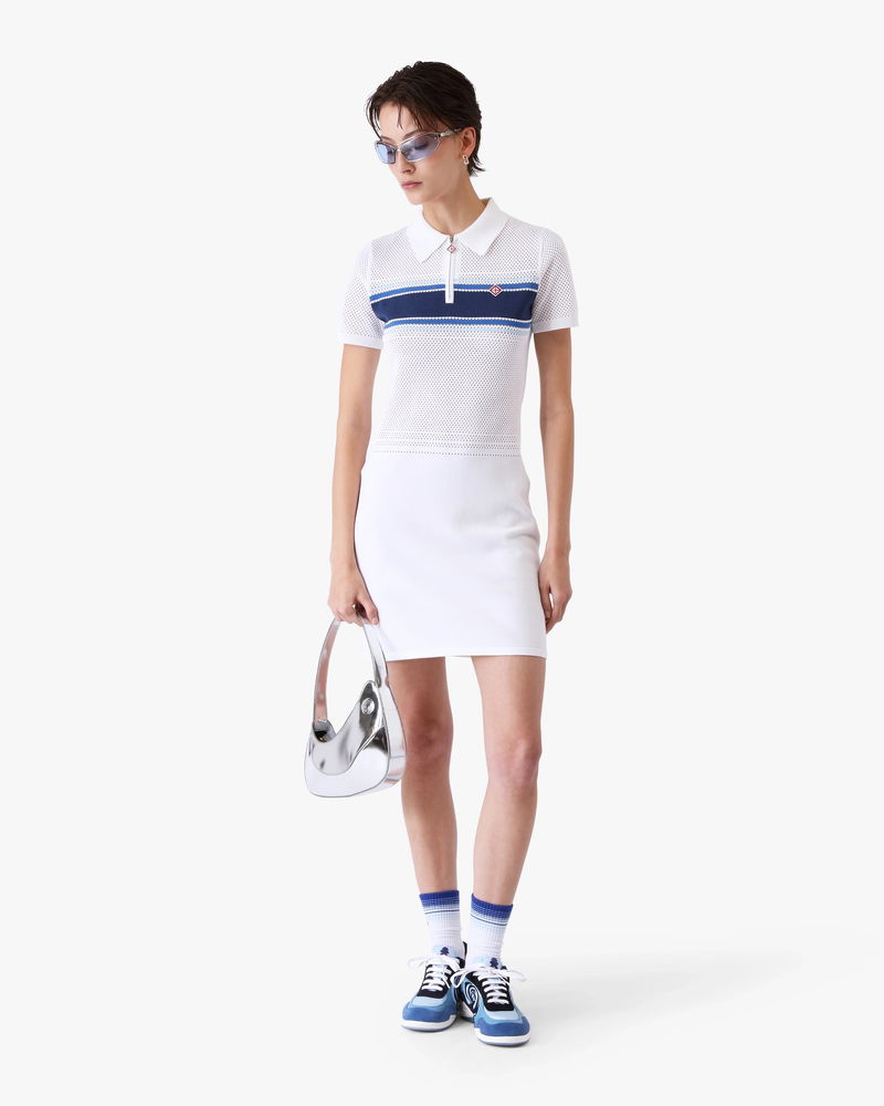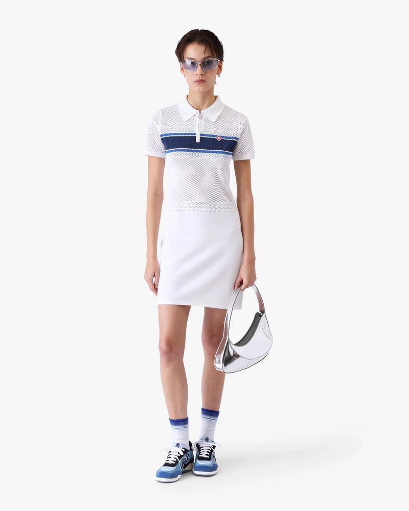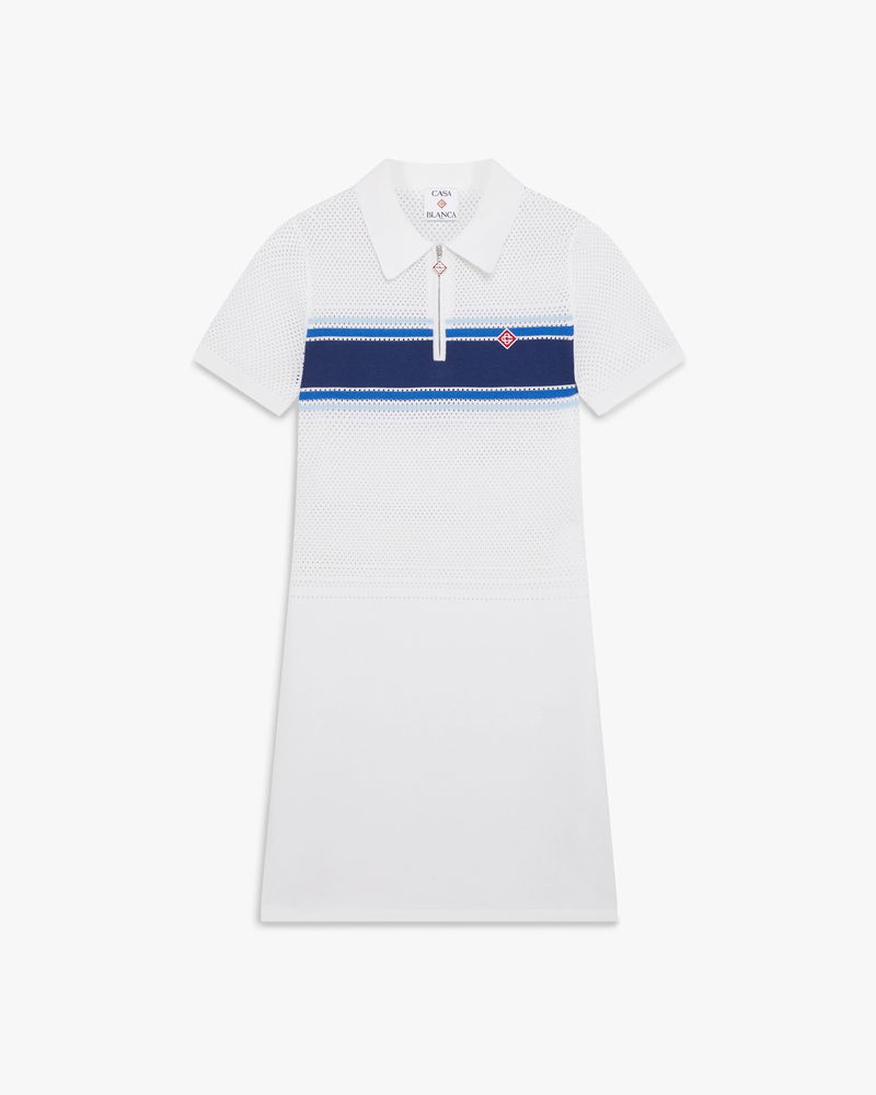 The white and blue striped mesh midi dress is a refined knitted design featuring a blue stripe across the chest, and back, with an elegant mesh stripe jacquard construction. Completed with a classic collar, a zip closure, the house's signature diamond logo, short-sleeves with rib cuffs, and a relaxed midi silhouette.